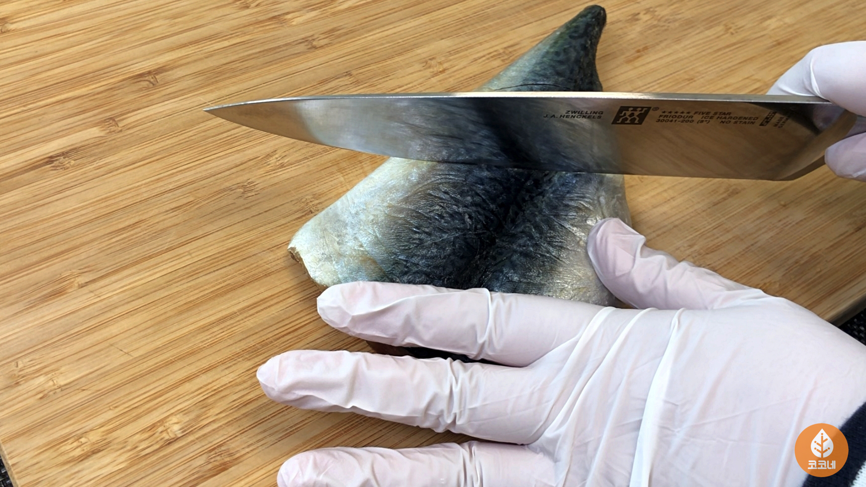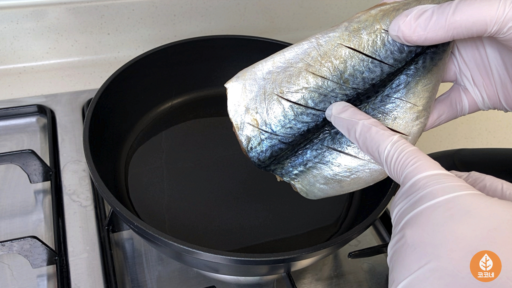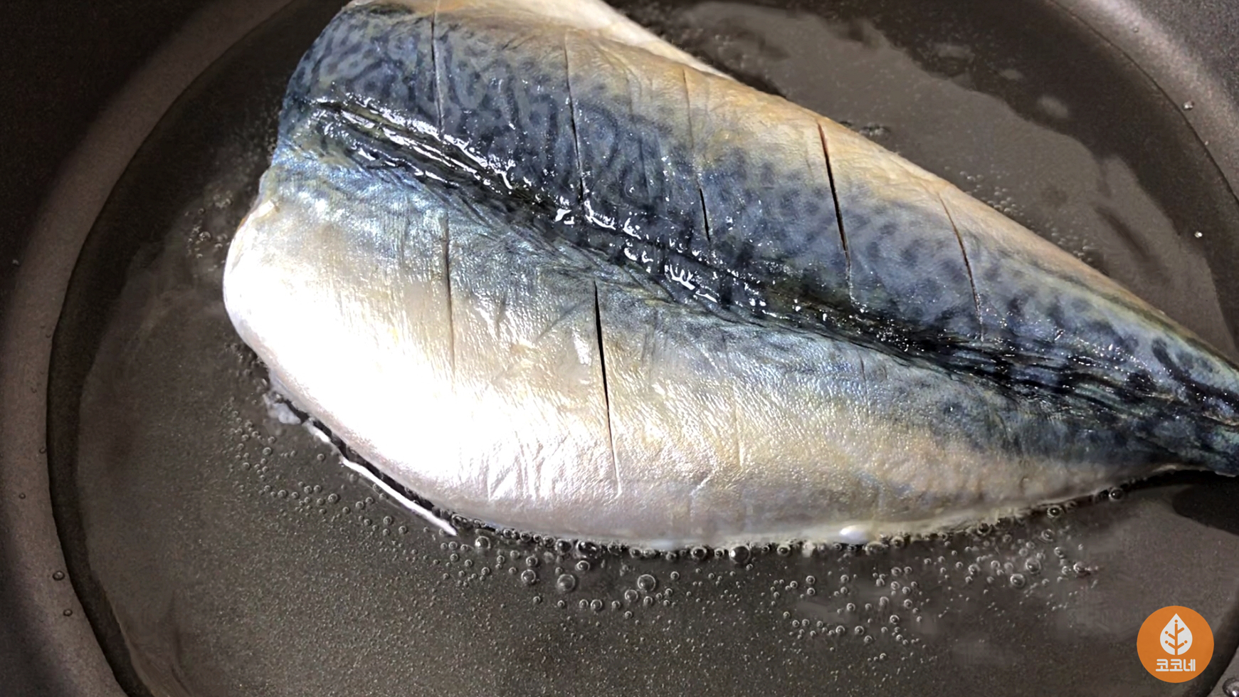 냉동생선을 물로 씻어서 등부분에 칼집을 넣고,