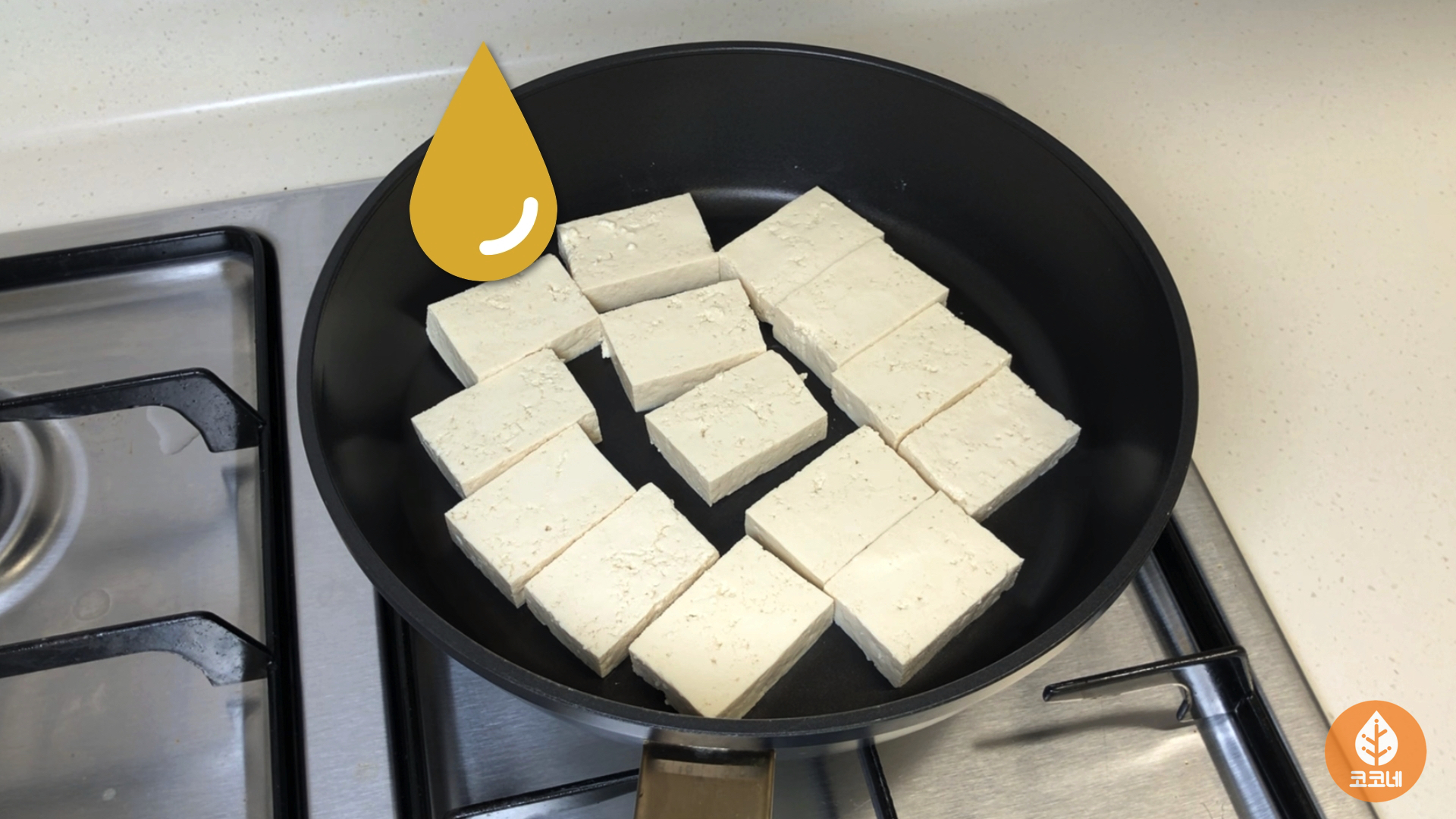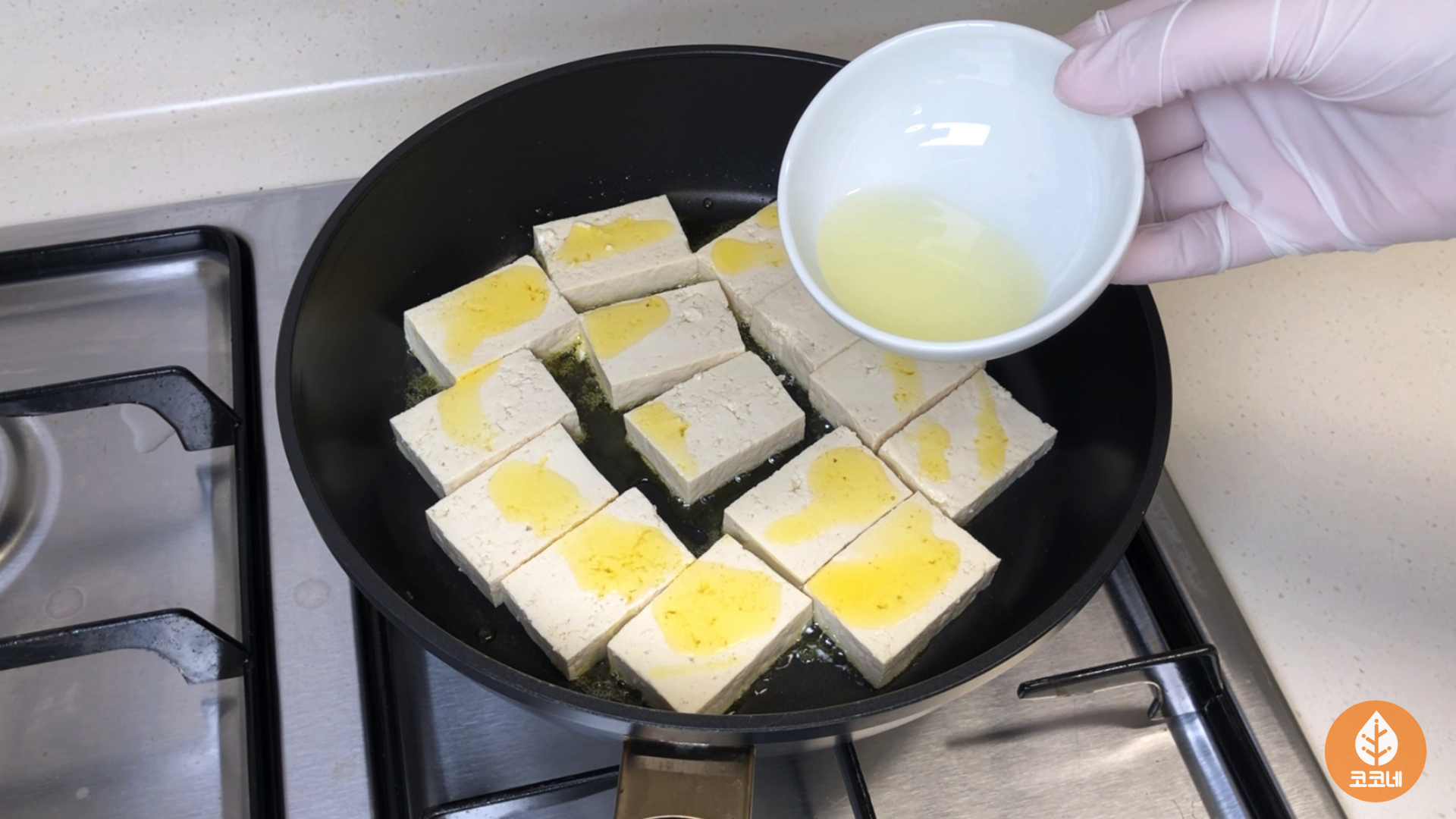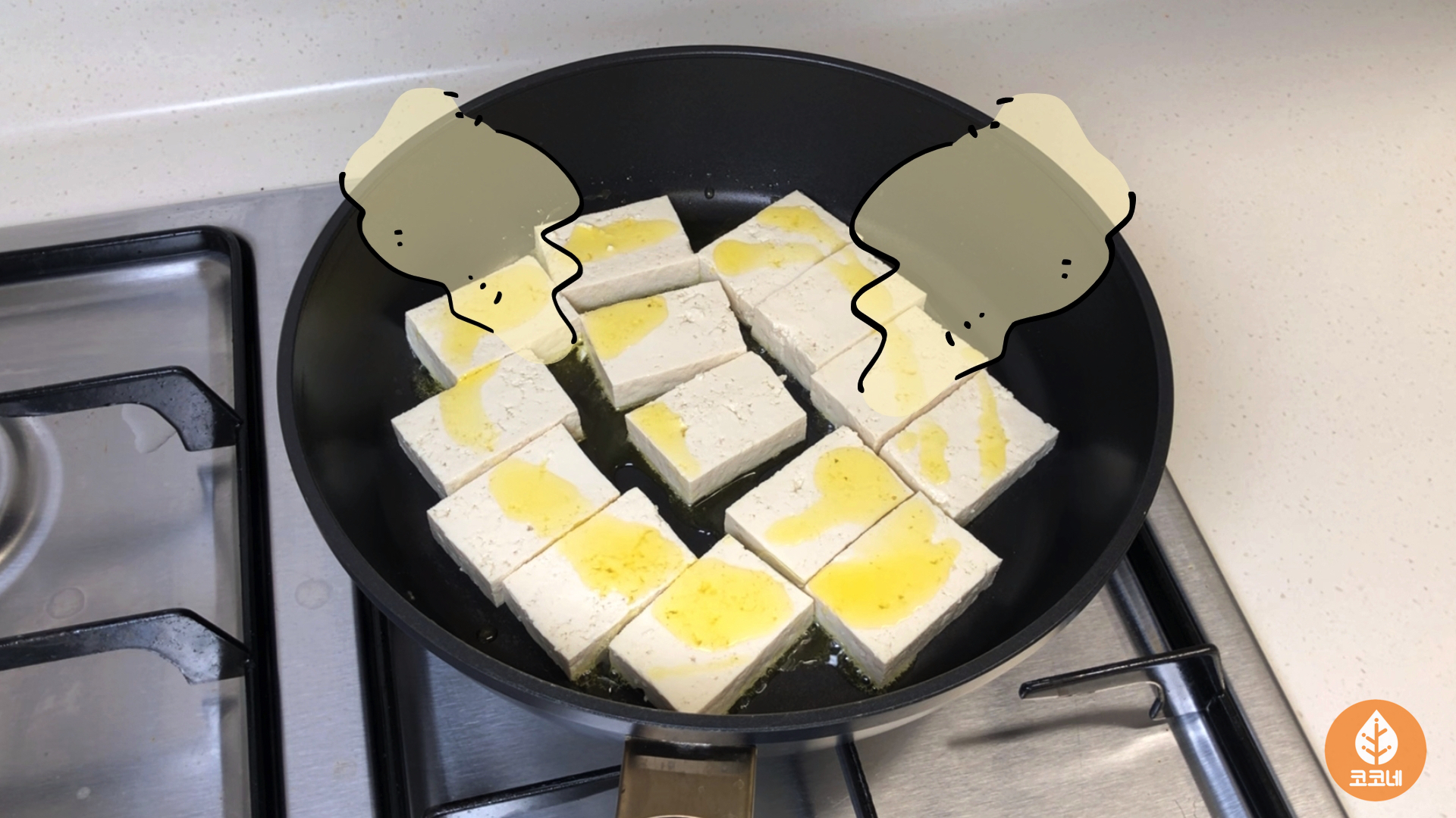 두부를 팬에 올리고 가스불을 켜면