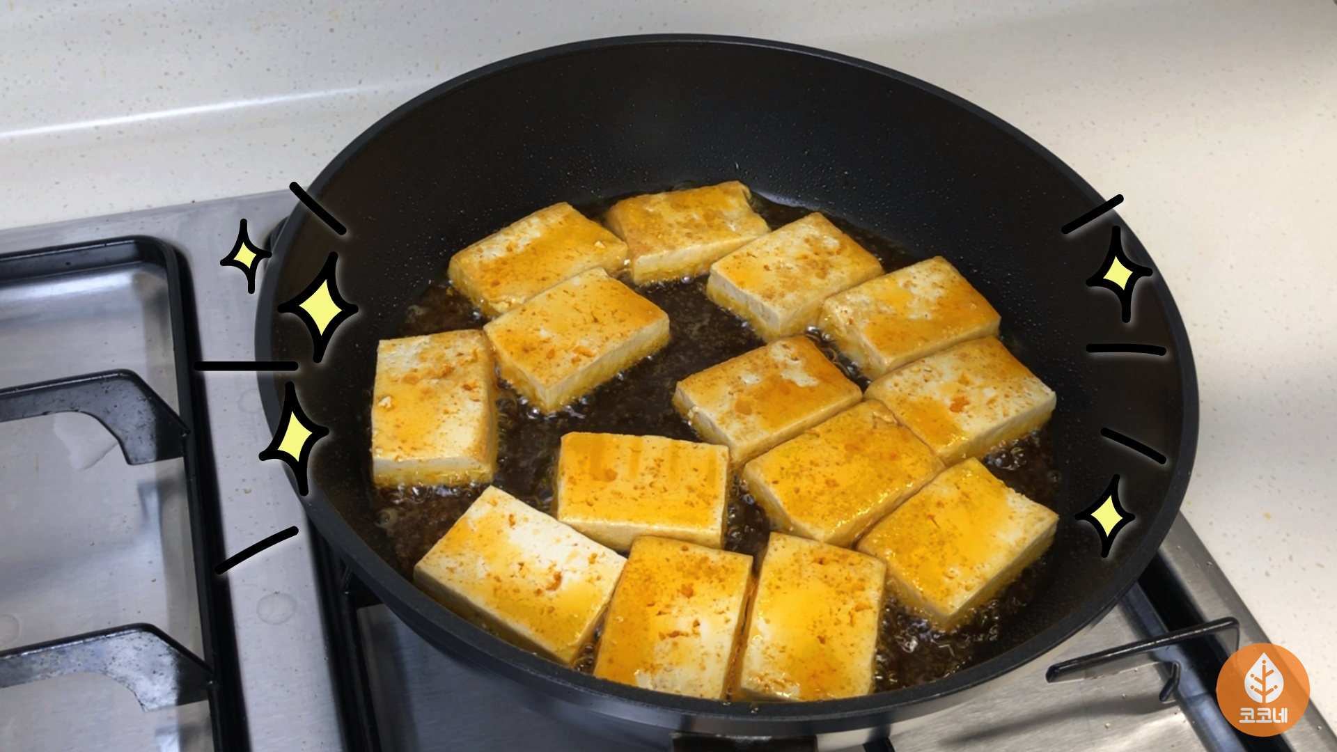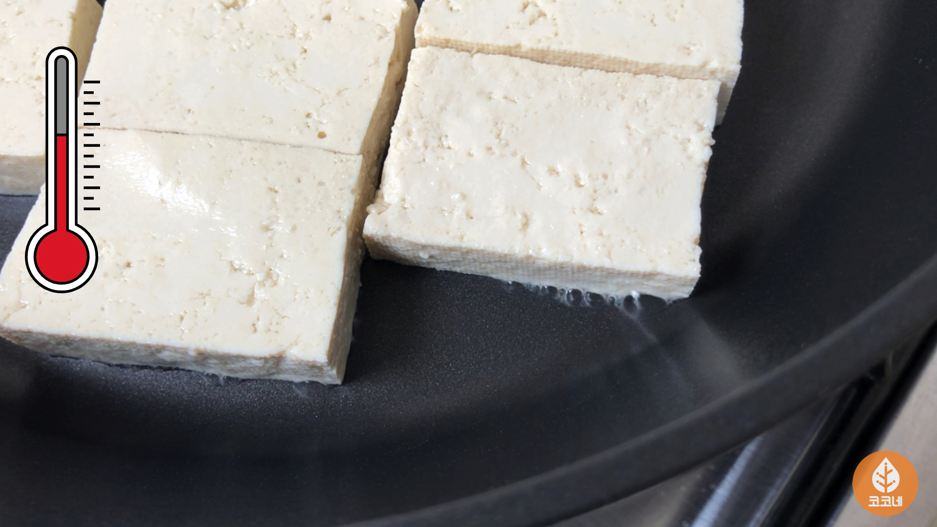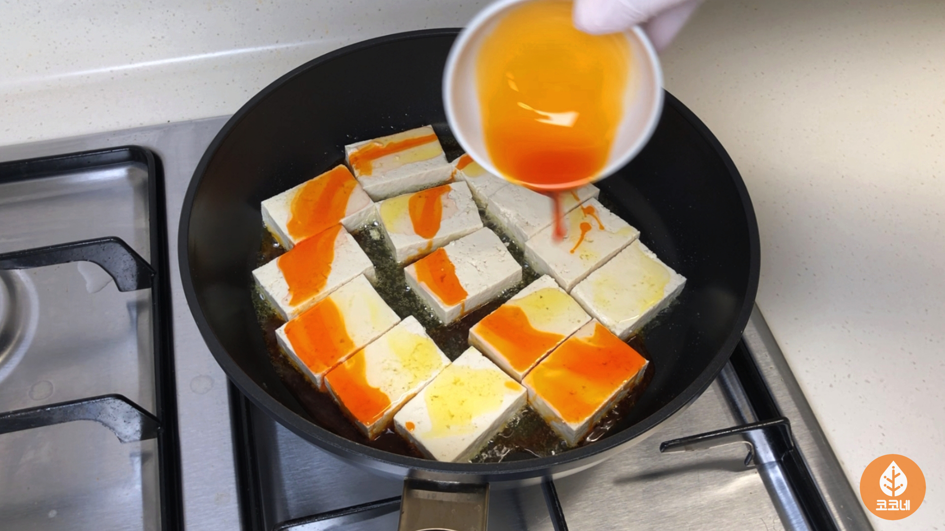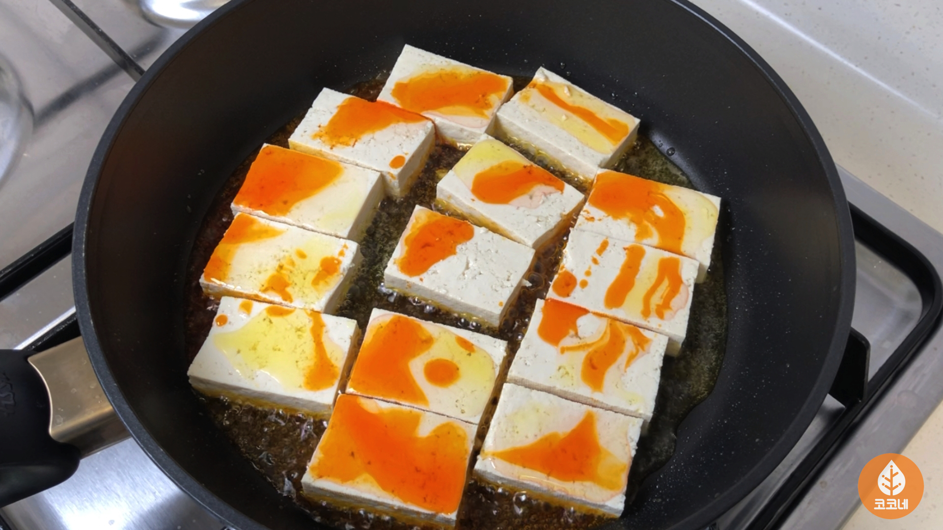 두부를 팬에 올리고 가스불을 켜면