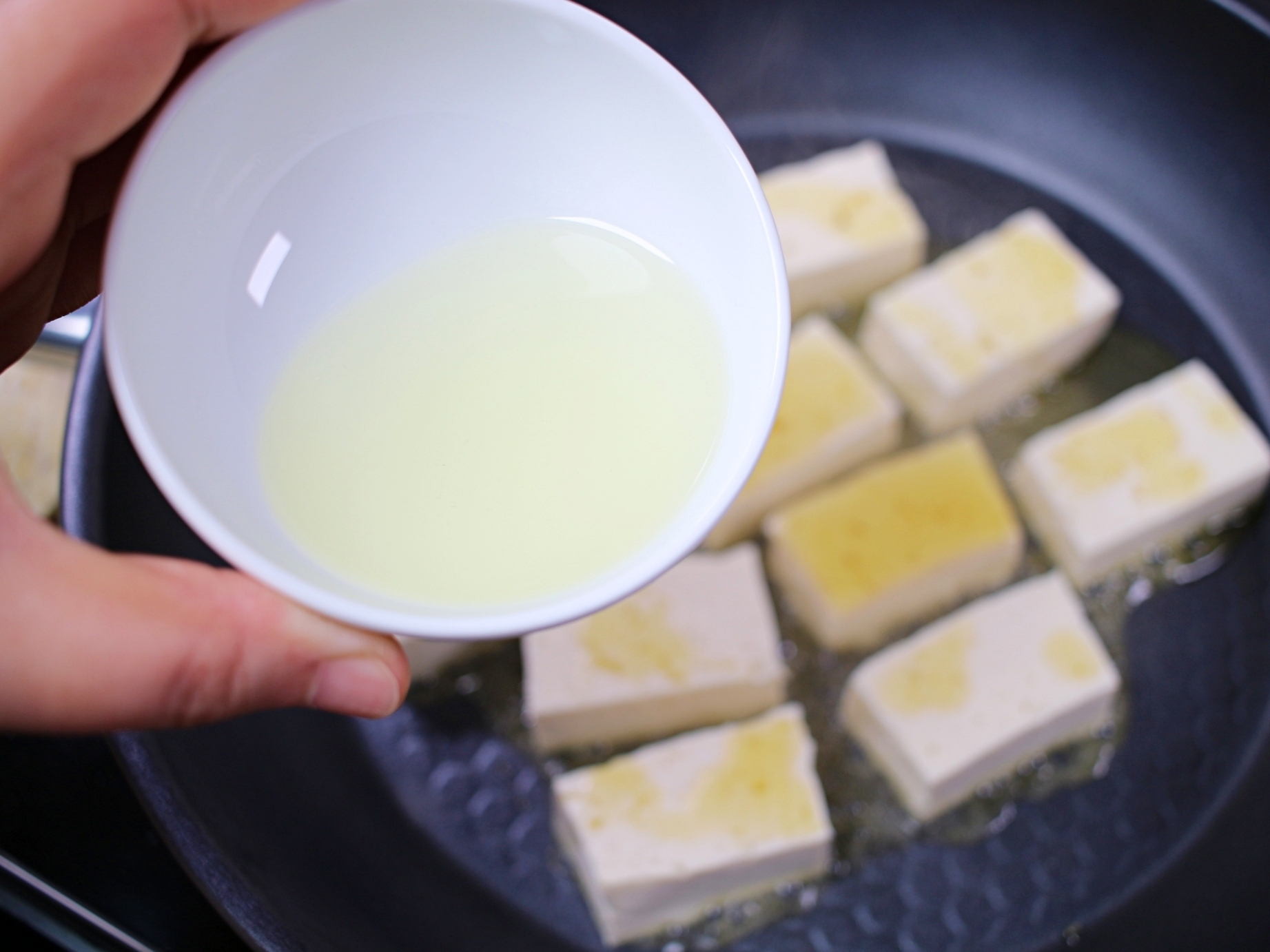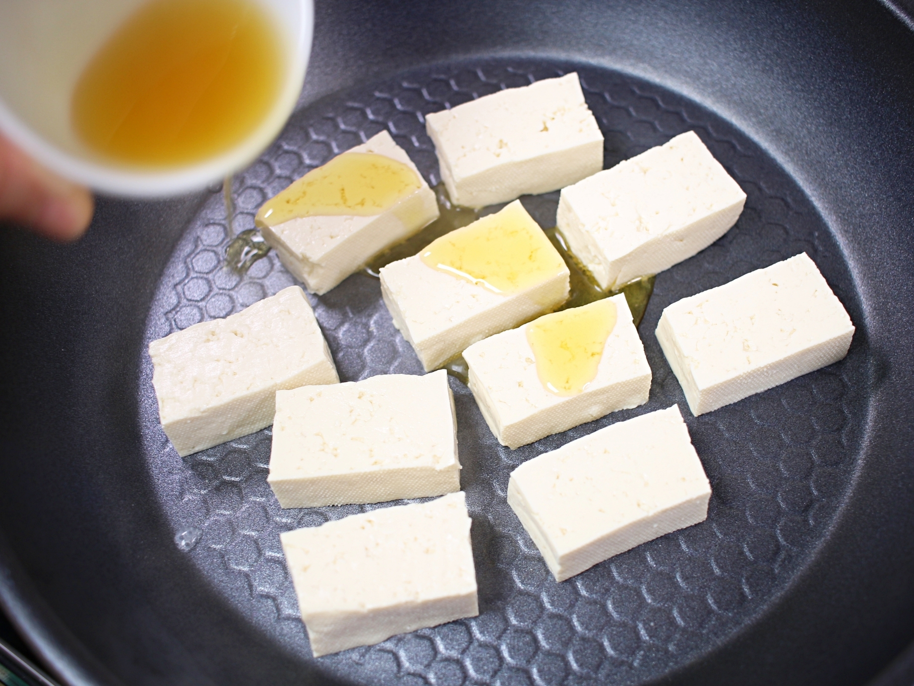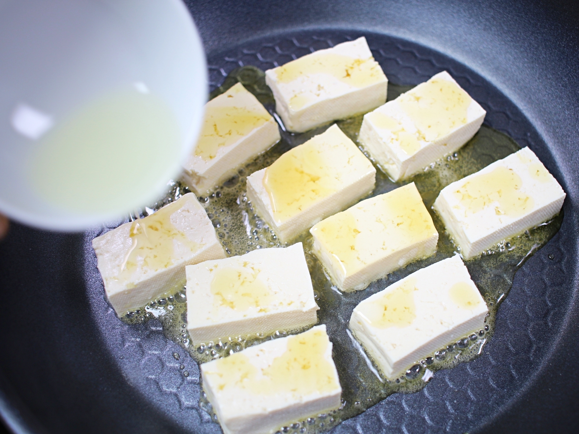 미리 예열하지 않은 상태로 두부를 올려서 조리해야
