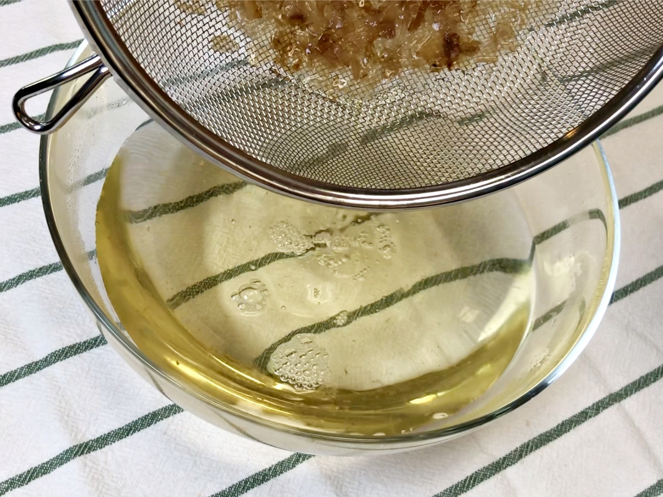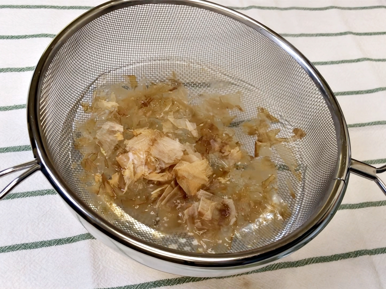 그릇 위에 체를 올리고 가쓰오부시를 담가주세요.