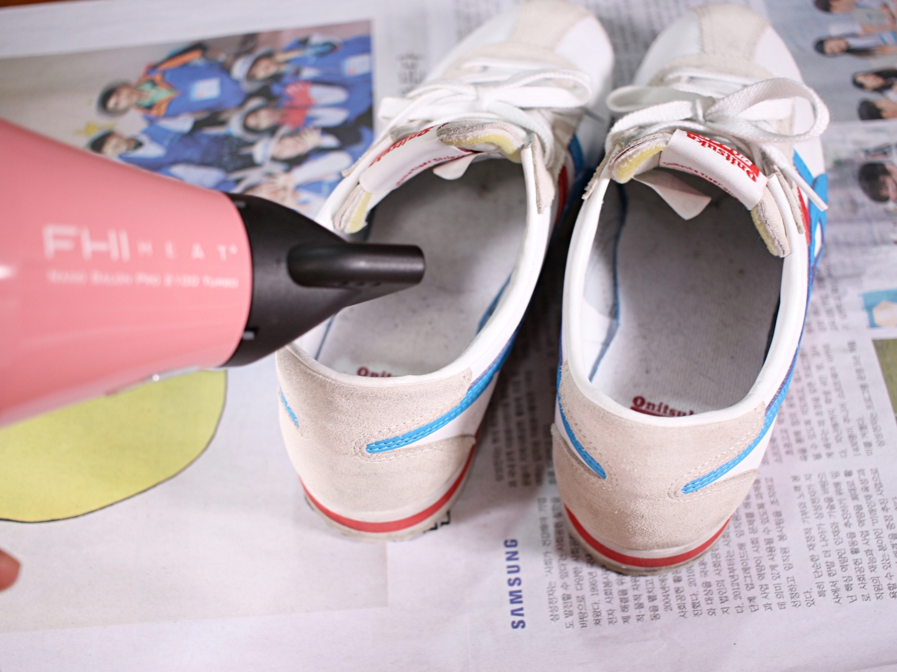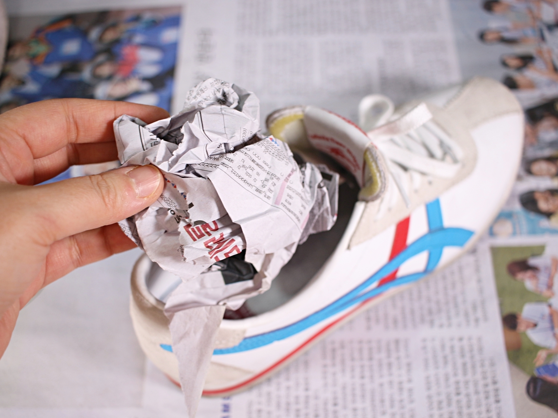 구겨진 신문지를 신발 속에 채워 넣고