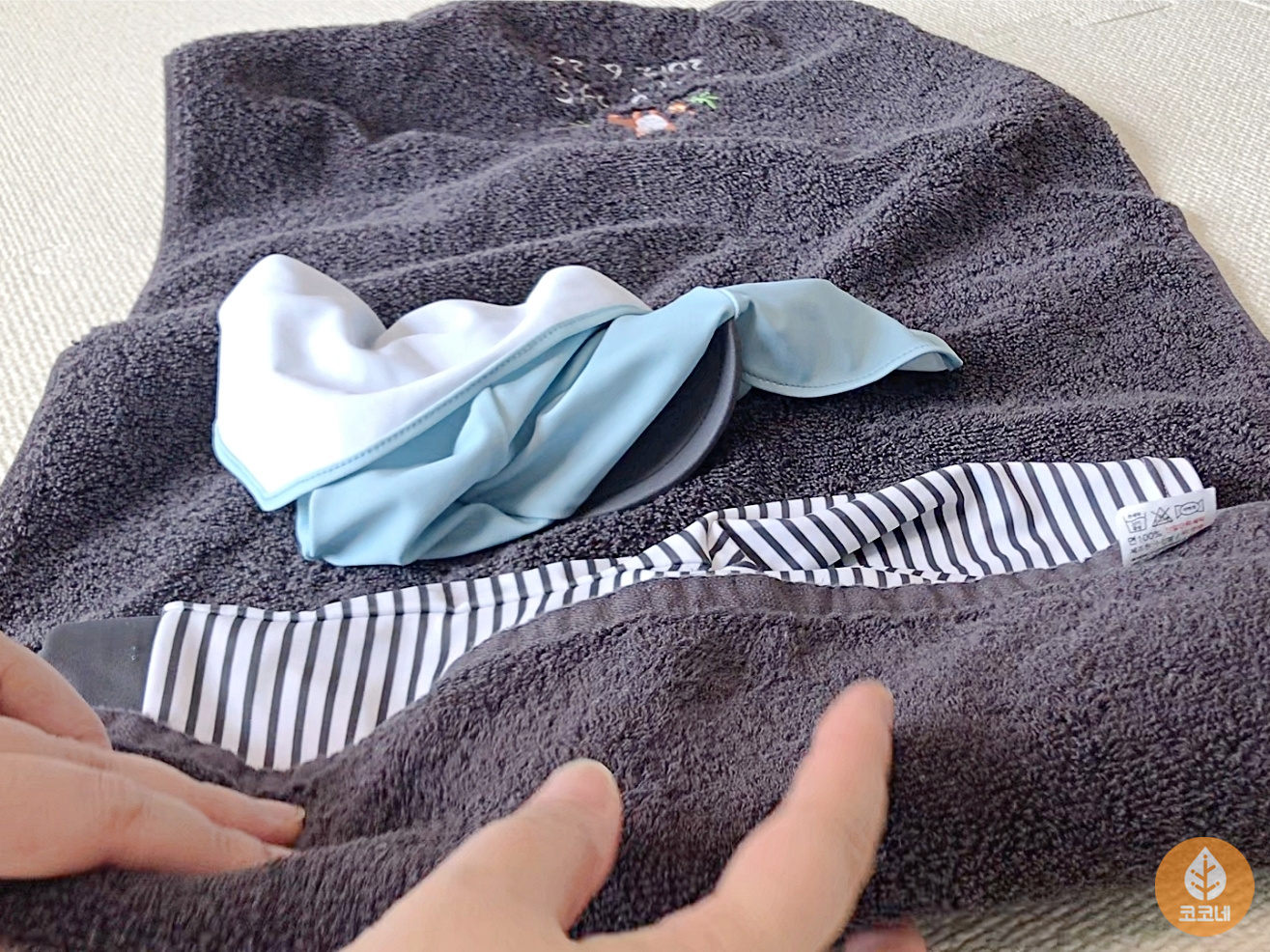 물기 없는 수건으로 돌돌 말아서 한번 더 물기를 빼요.