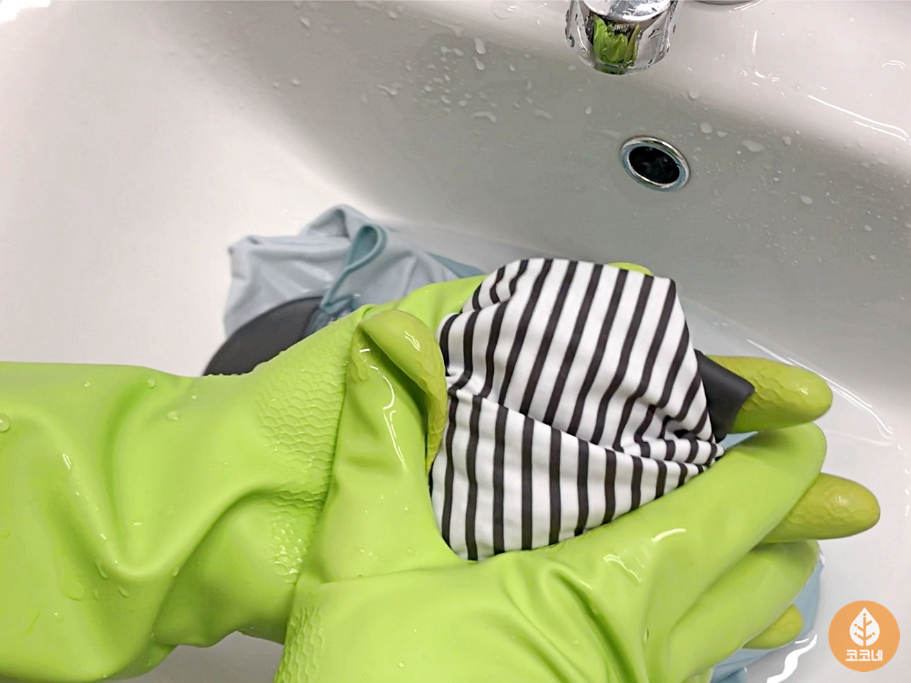 물로 헹굴 때는 세게 문지르거나 비틀지 말고