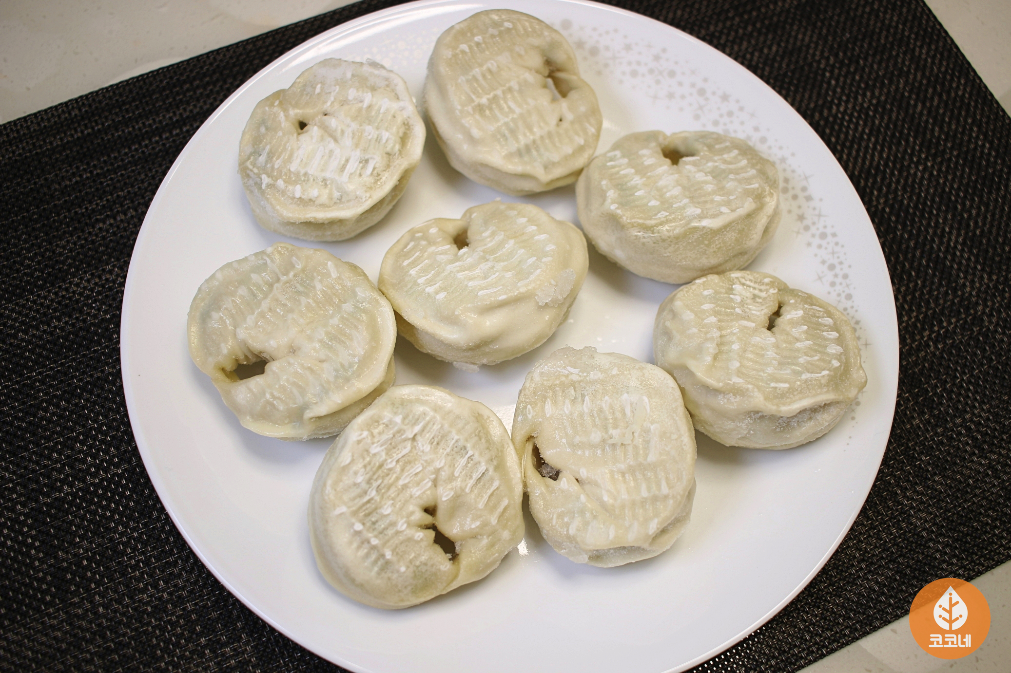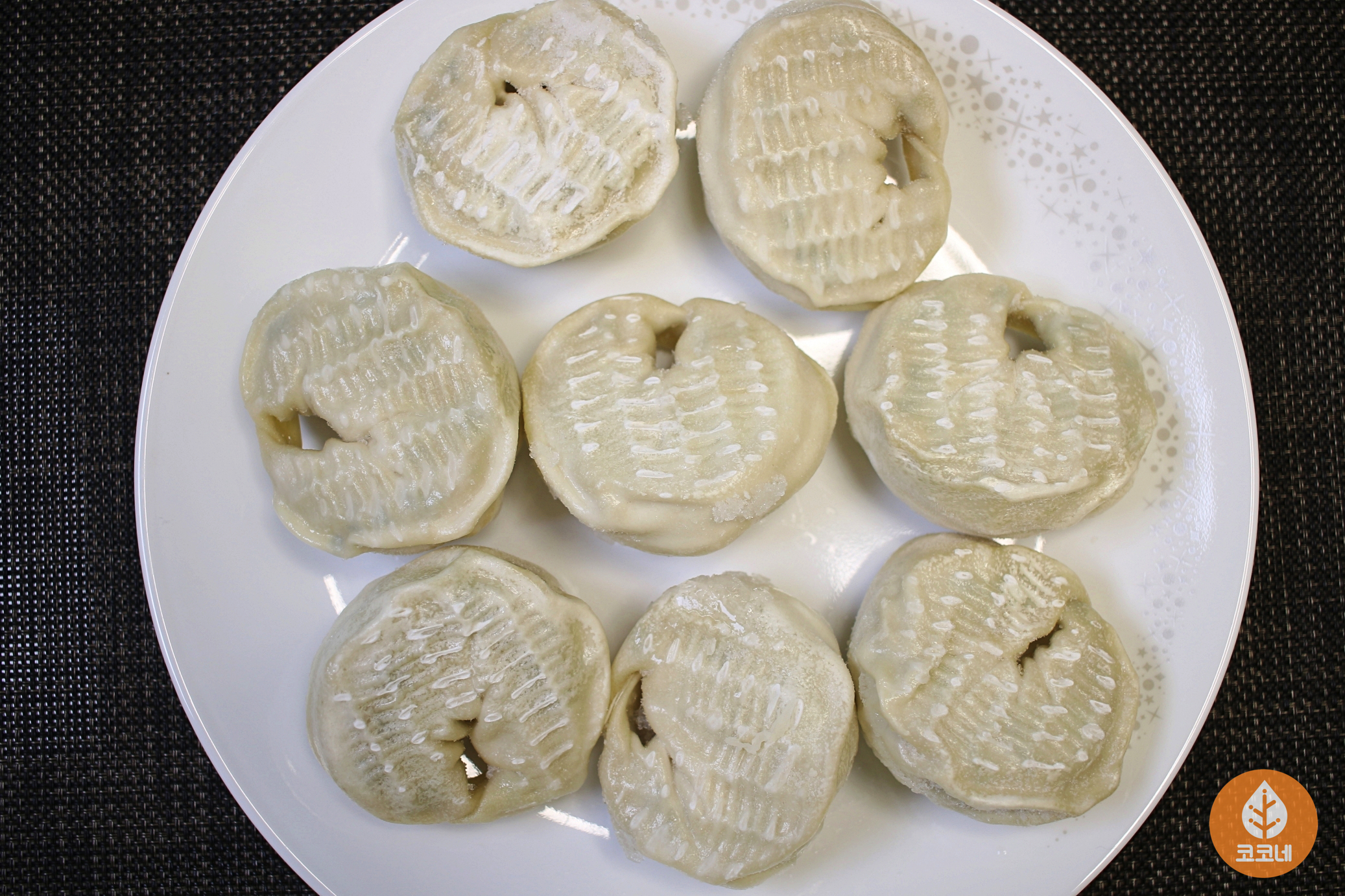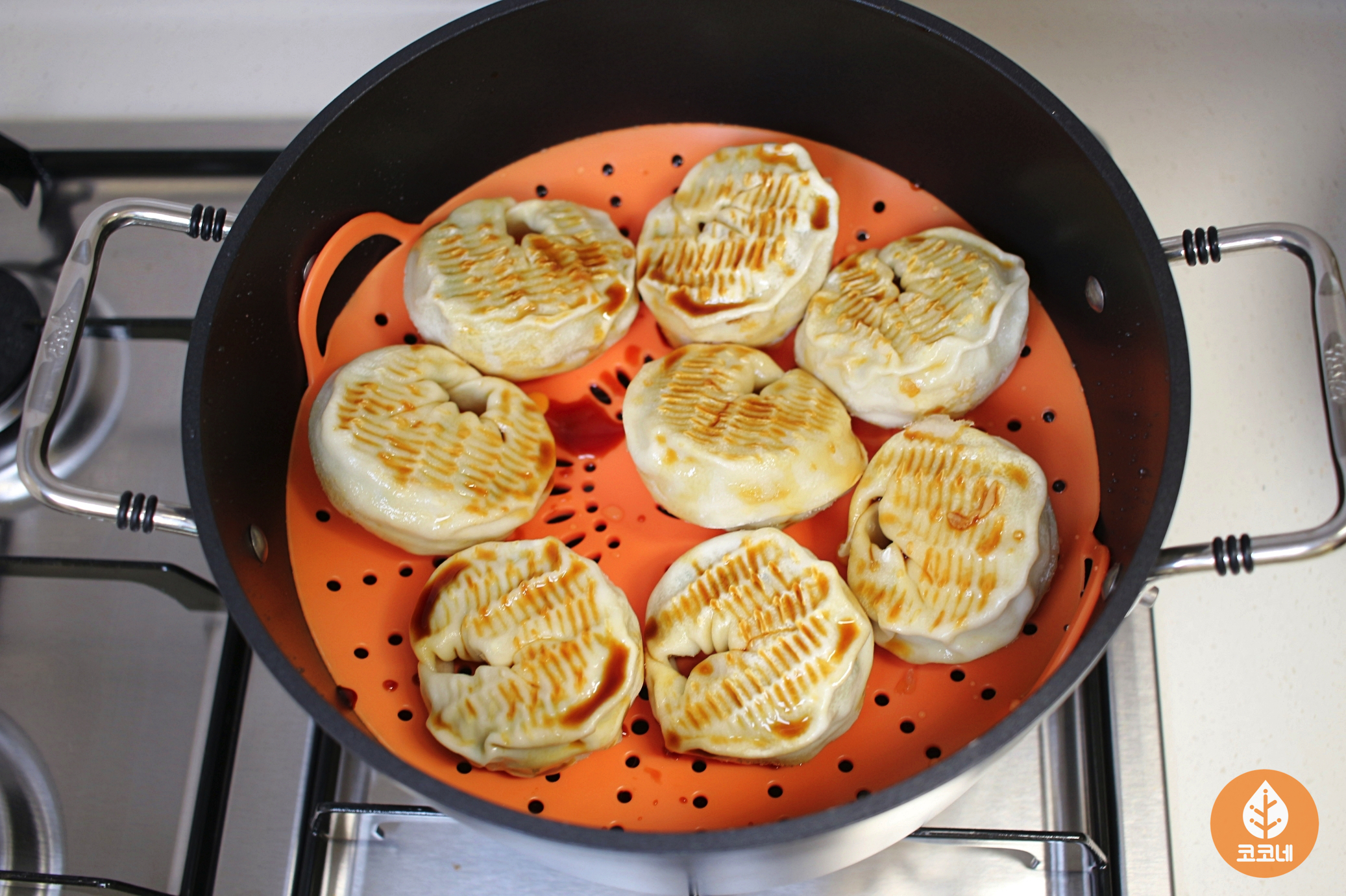 첫 번째는 만두를 뒤집어서 찌는거예요.