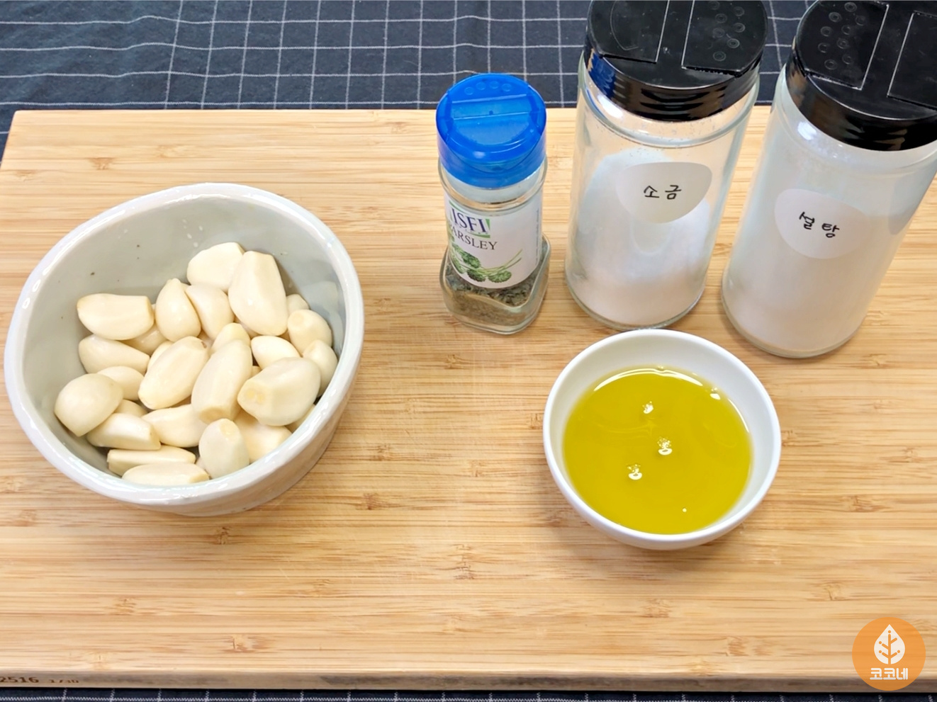 재료는 통마늘, 올리브오일, 소금, 설탕 준비해요.