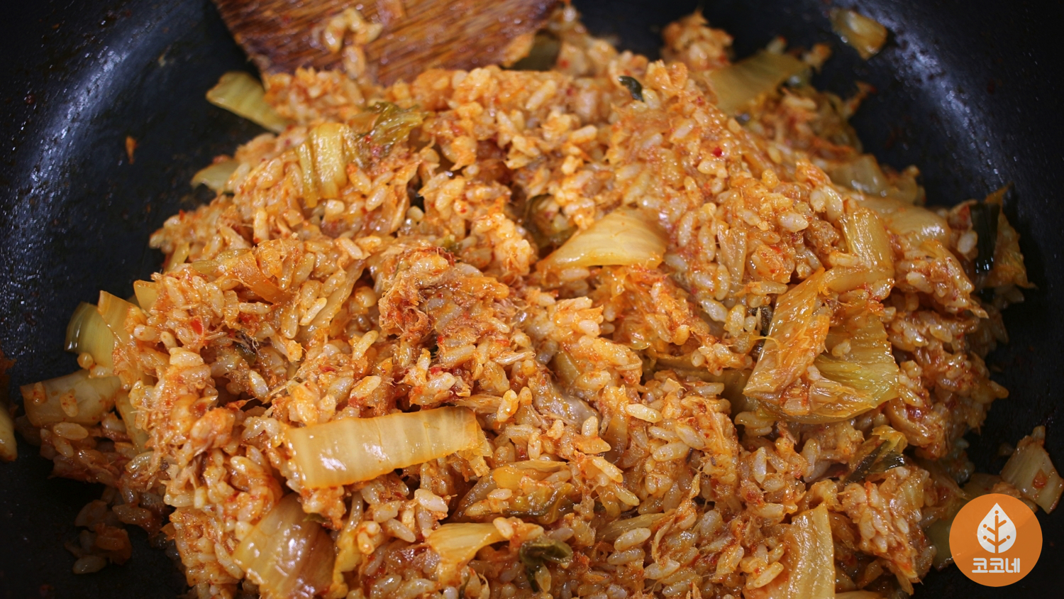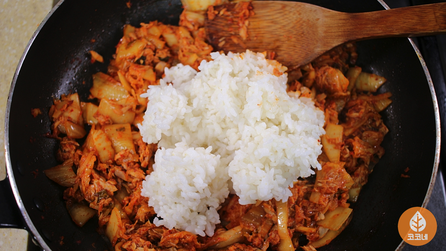 기름기를 뺀 참치를 넣고 볶아주세요.