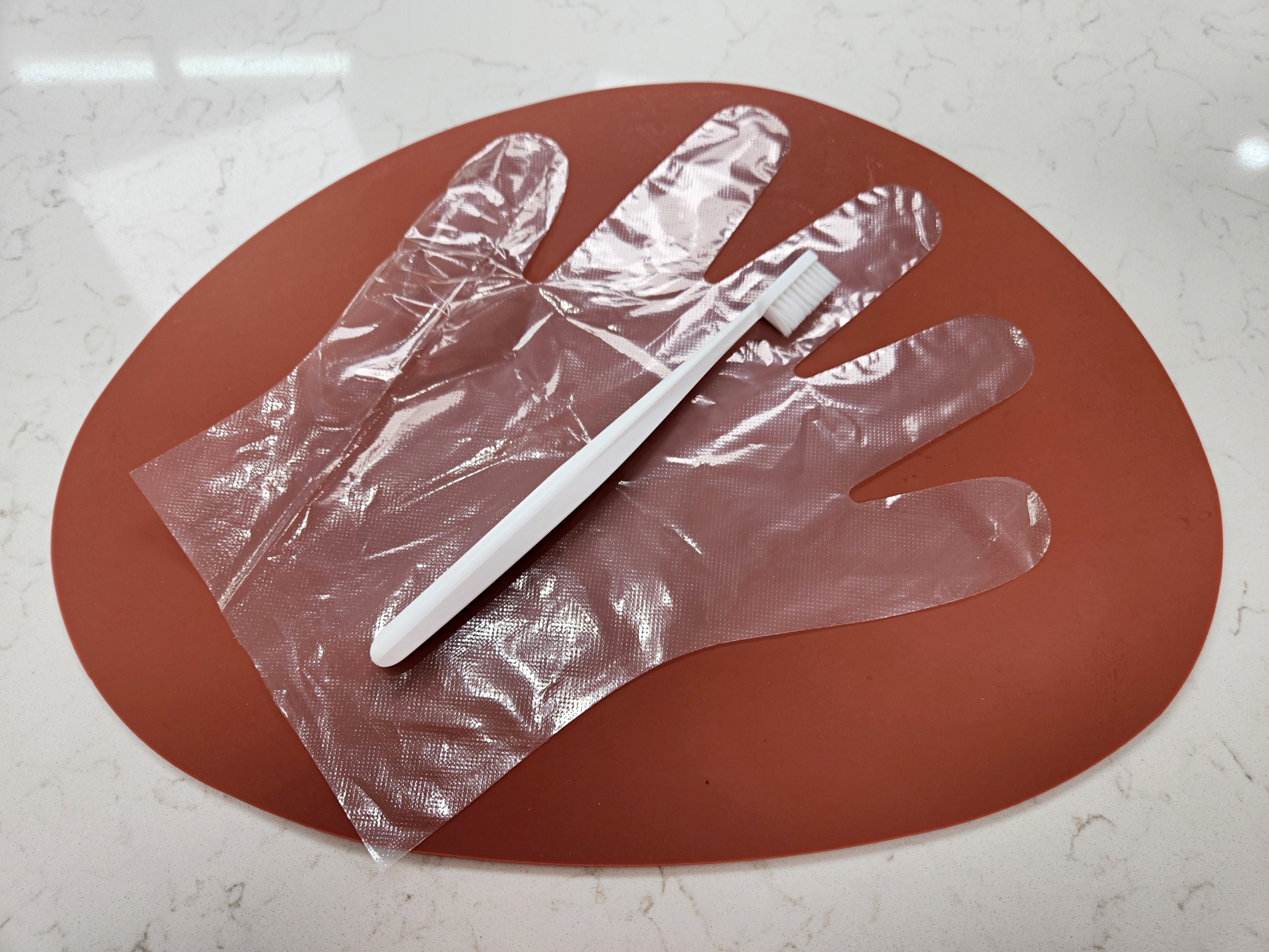 장갑의 손가락 부분마다 칫솔을 하나씩 넣어주세요.