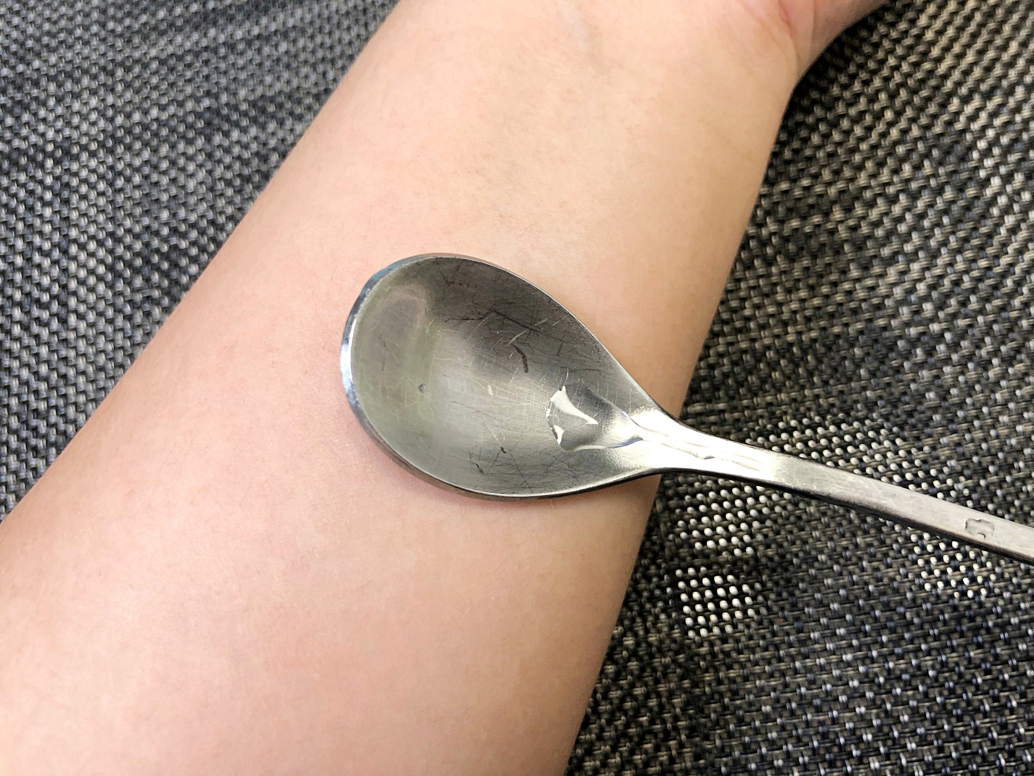 따뜻해진 숟가락을 모기 물린 곳에 조심히 꾹~ 눌러주세요.