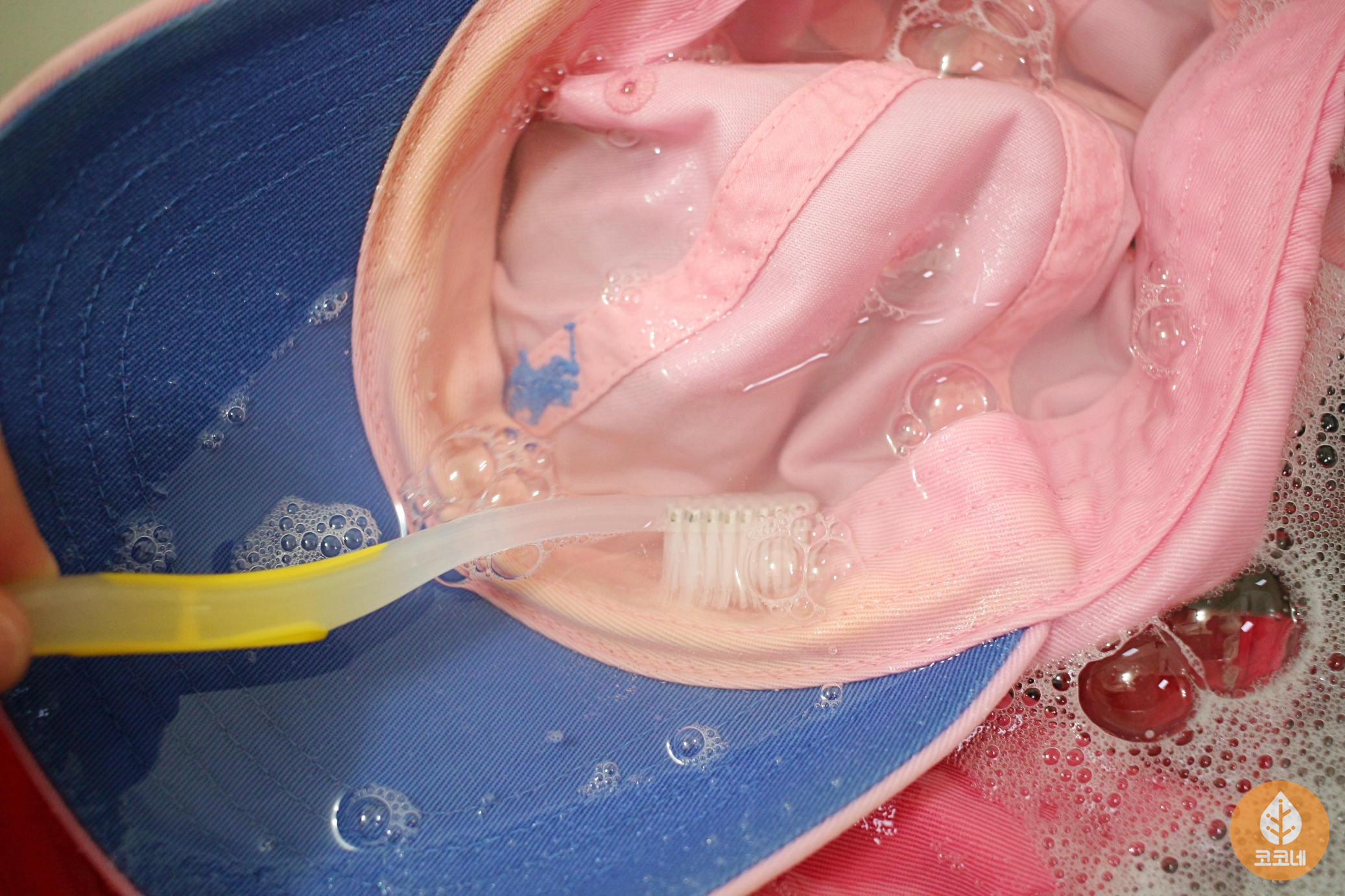 세제물에 모자를 완전히 담근 상태로