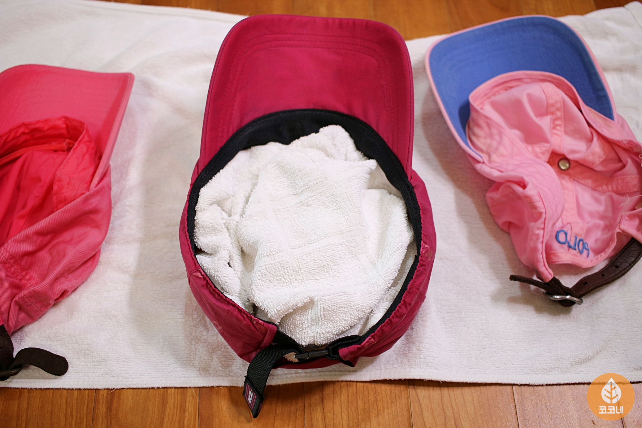 마른 수건으로 모자를 두드려서 물기를 흡수시킨 다음