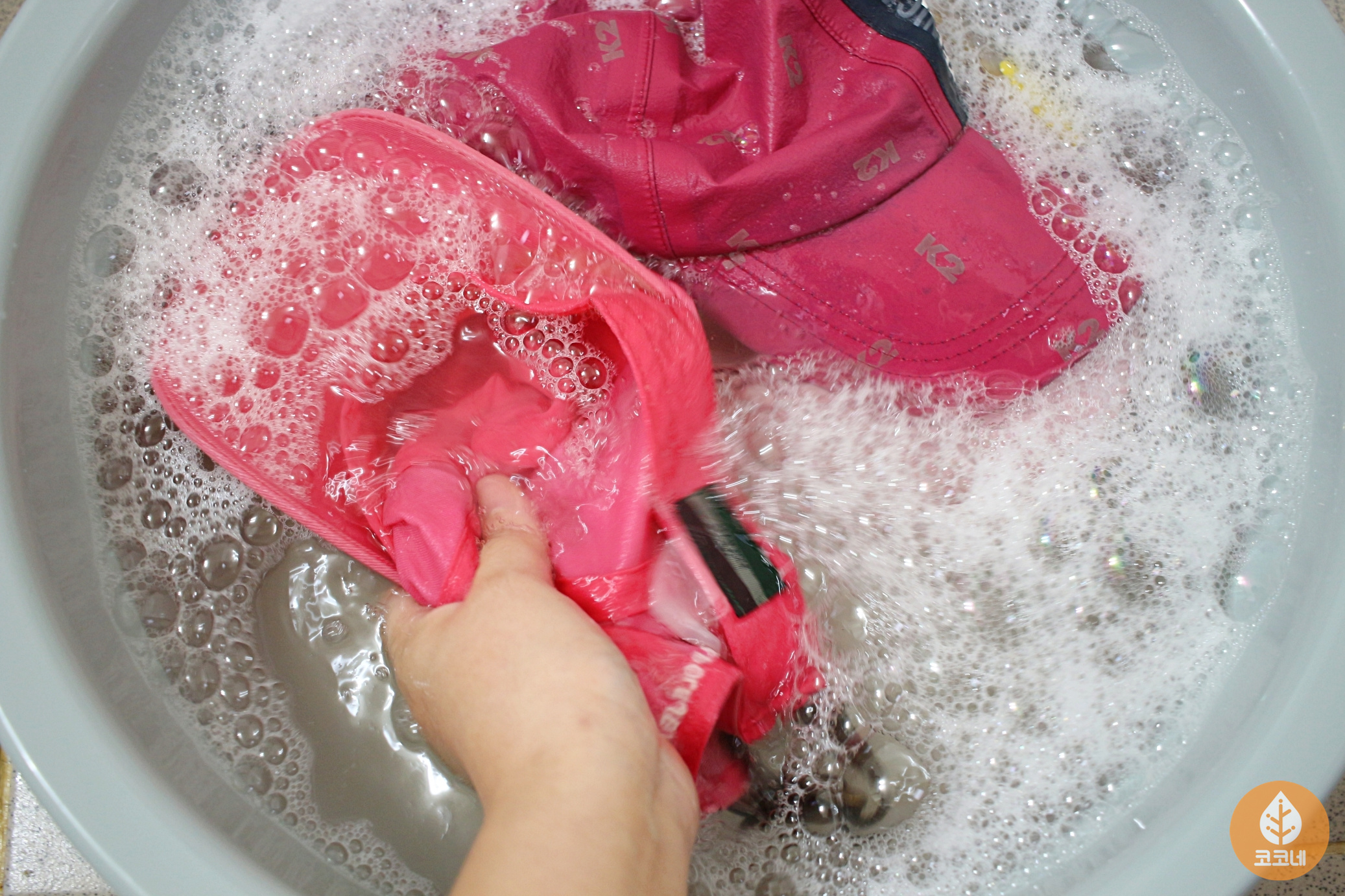 세제물에 모자를 완전히 담근 상태로