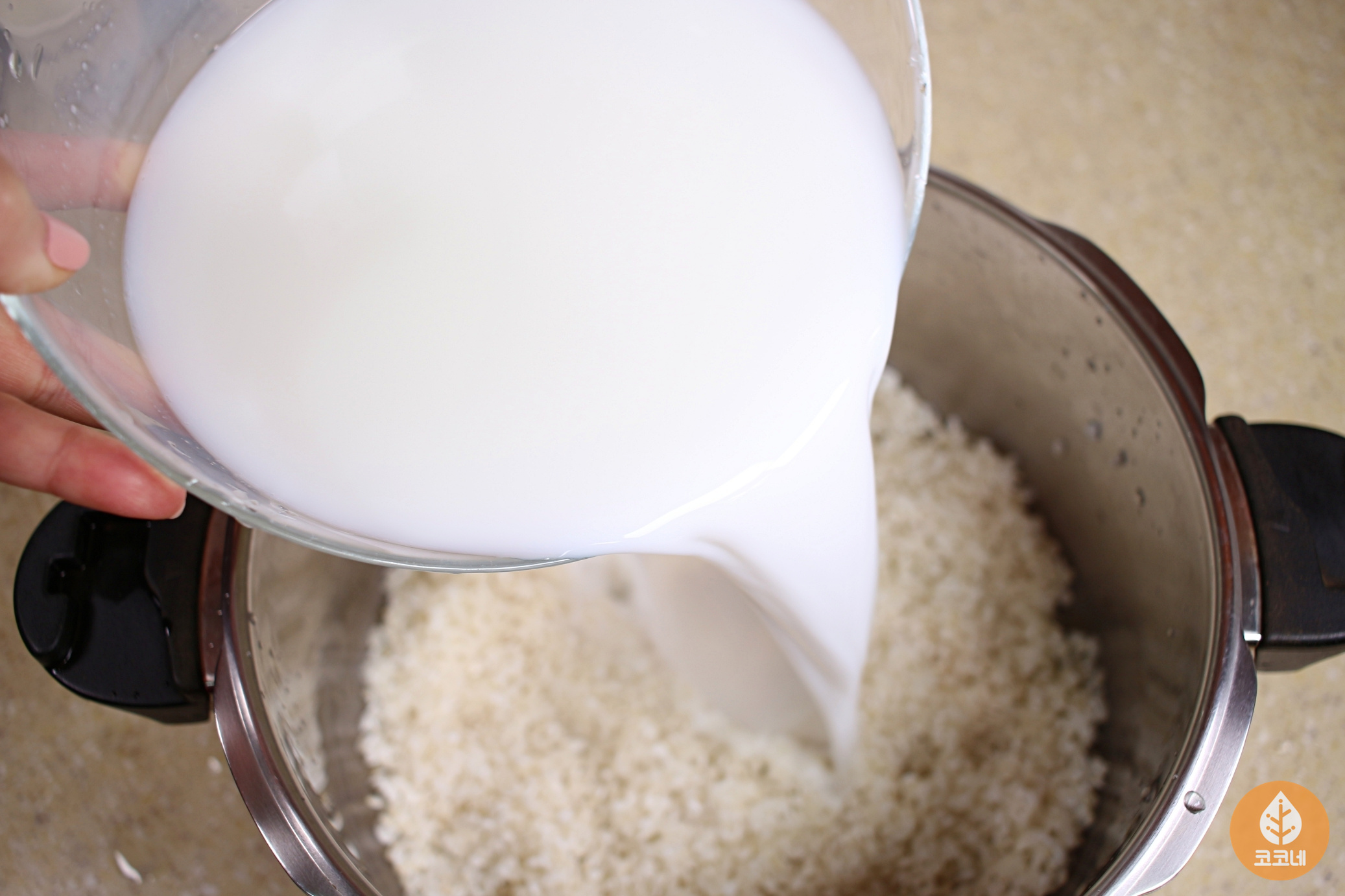 우유를 섞은 밥물을 부어주세요.