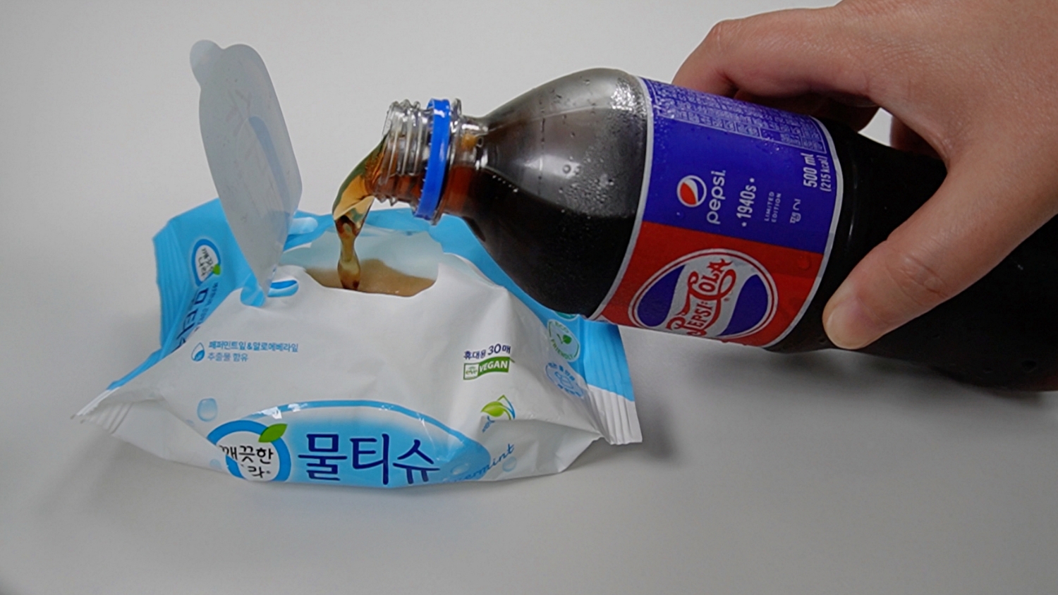 물티슈에 콜라를 붓는 것 만으로도 이미 대박입니다!