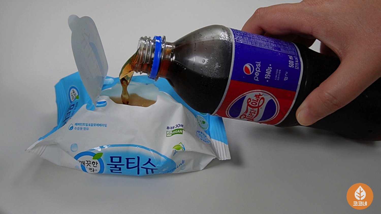 물티슈에 콜라를 붓기만 하면 된답니다.