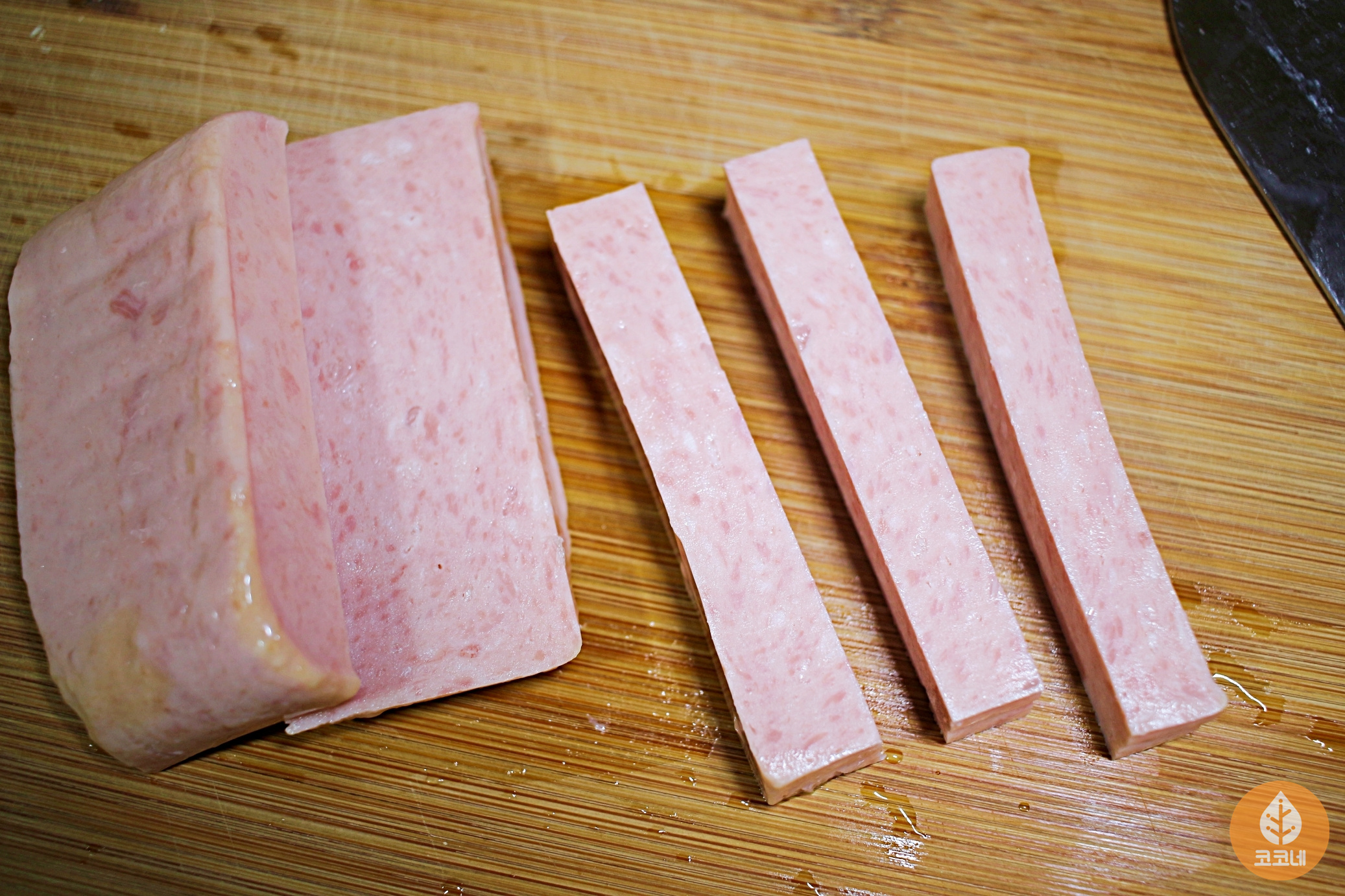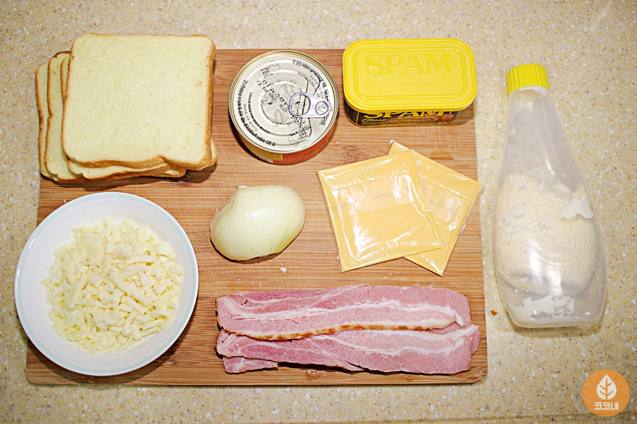 재료는 베이컨, 식빵, 모짜렐라치즈, 참치캔, 양파, 스팸,
