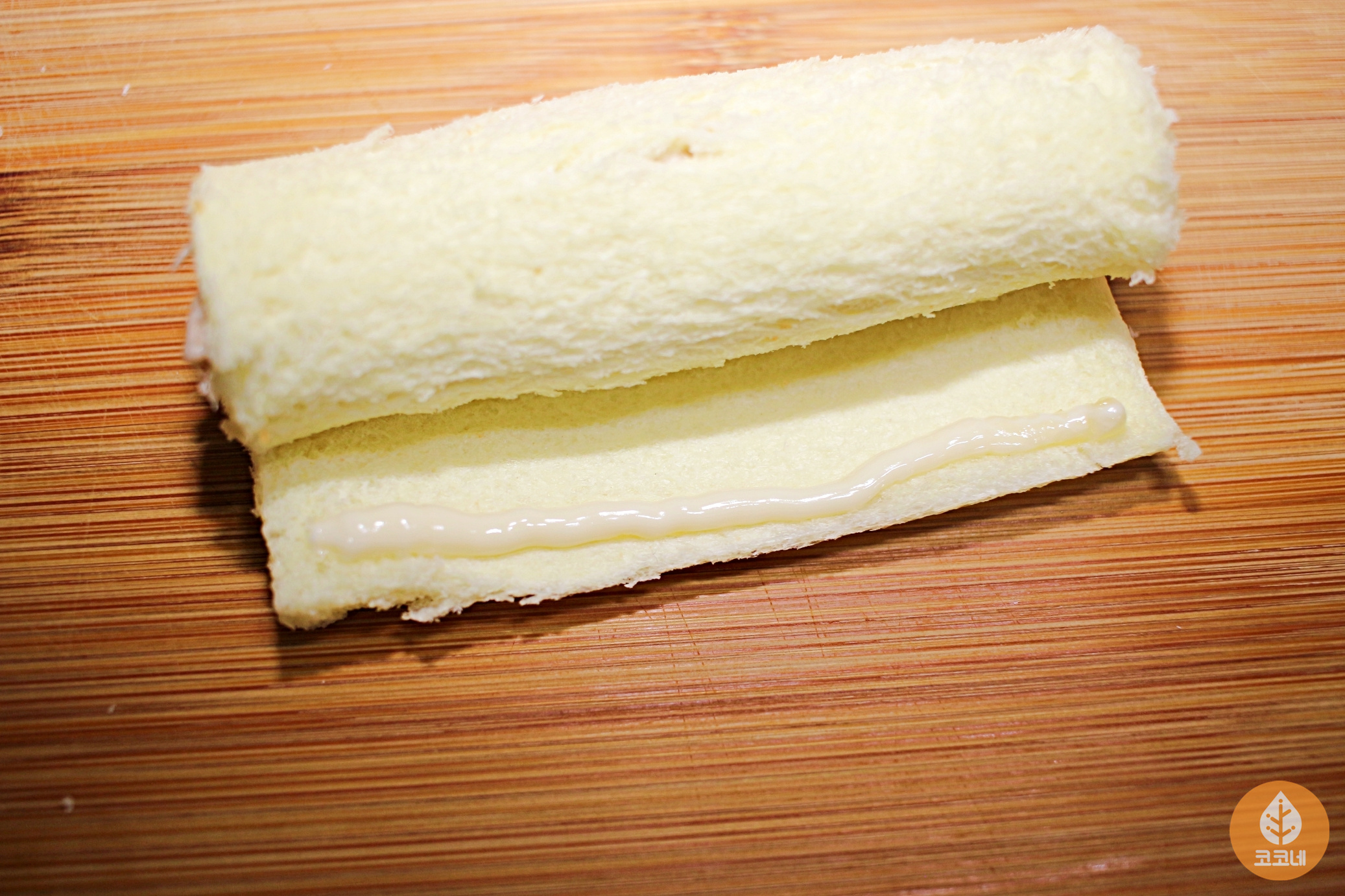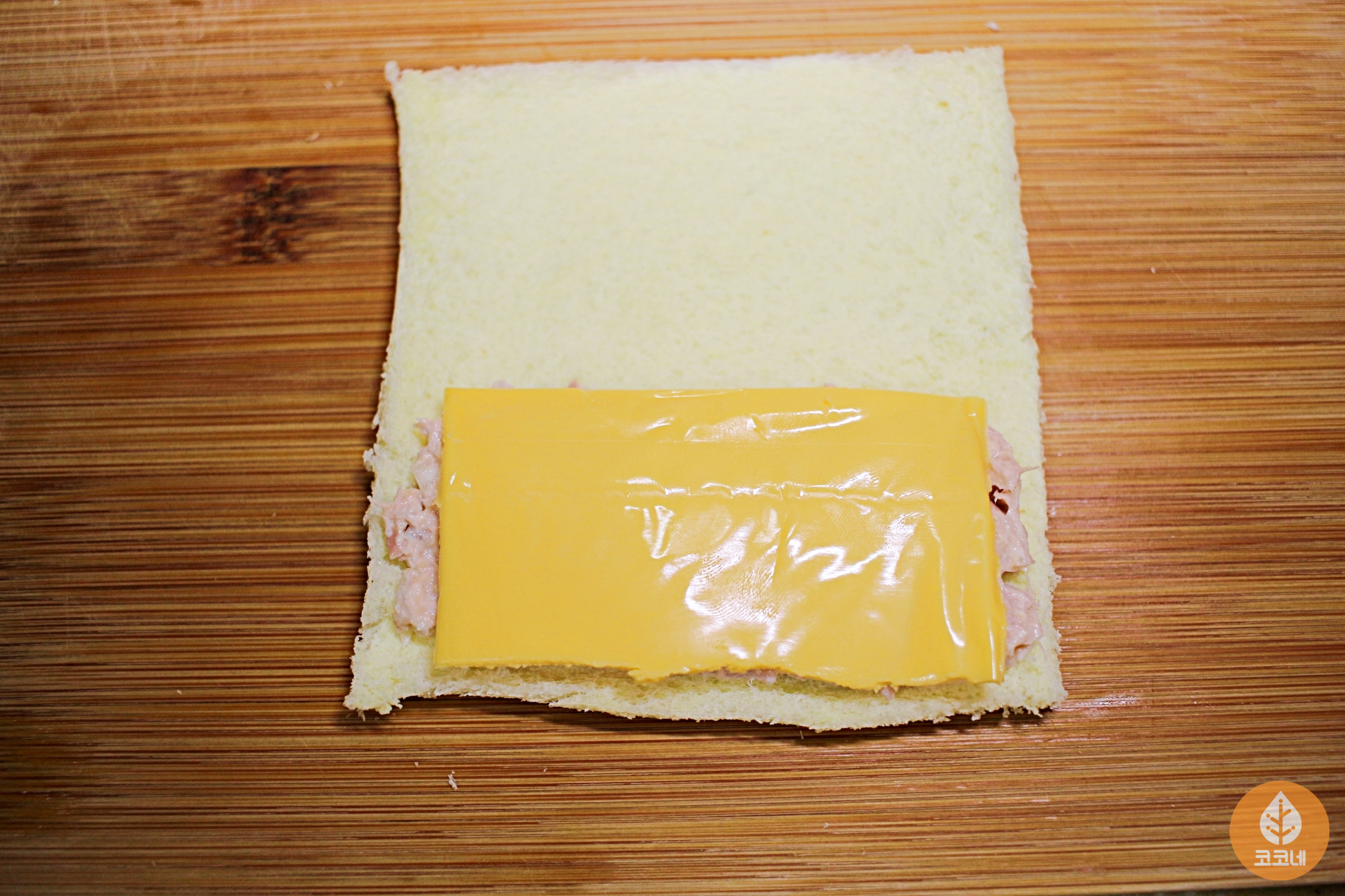 식빵 위에 참치마요랑 슬라이스치즈 올려서 돌돌 말고