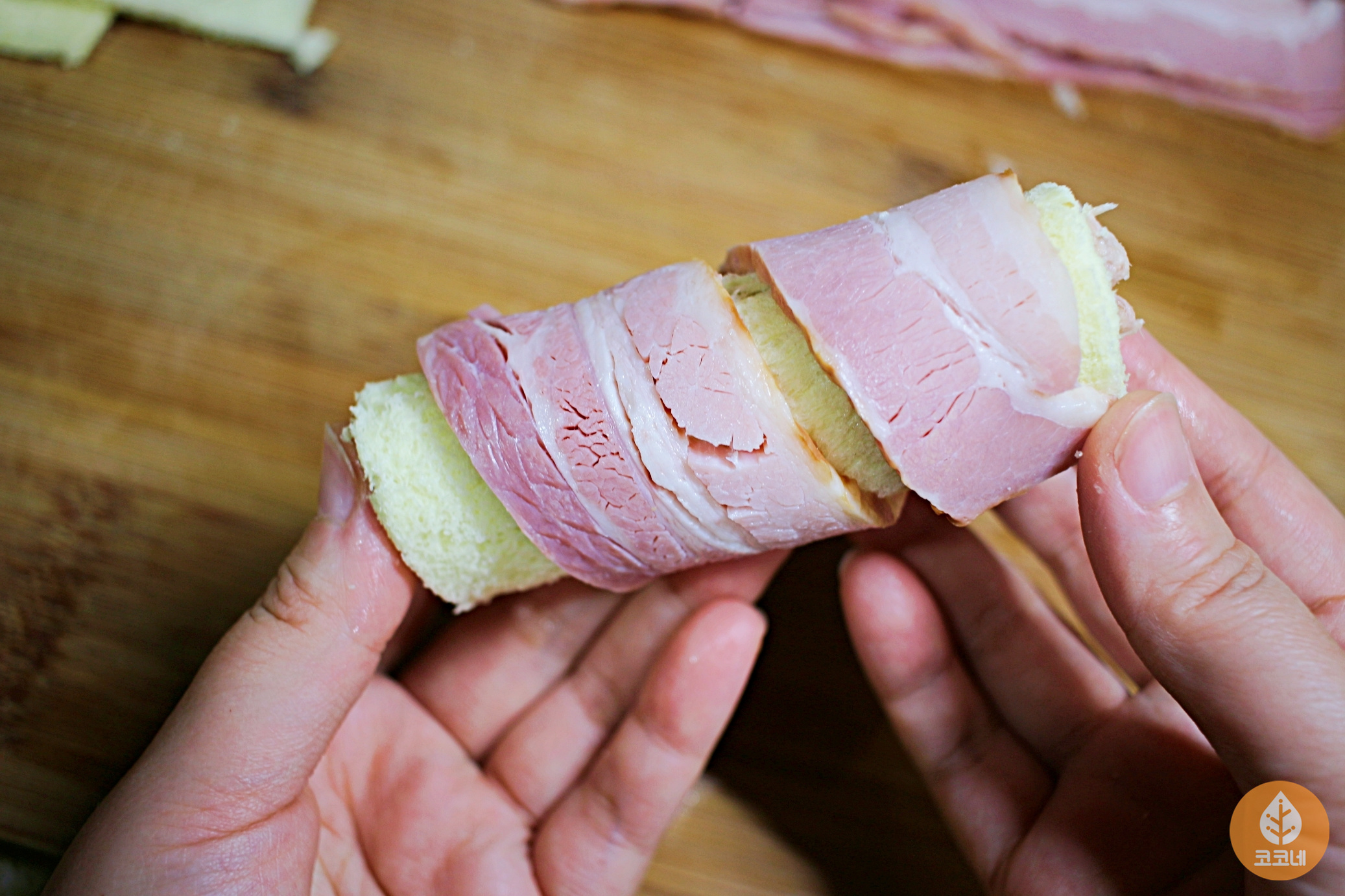 그리고 베이컨 한줄을 삥 둘러서 감아주면 준비 끝!