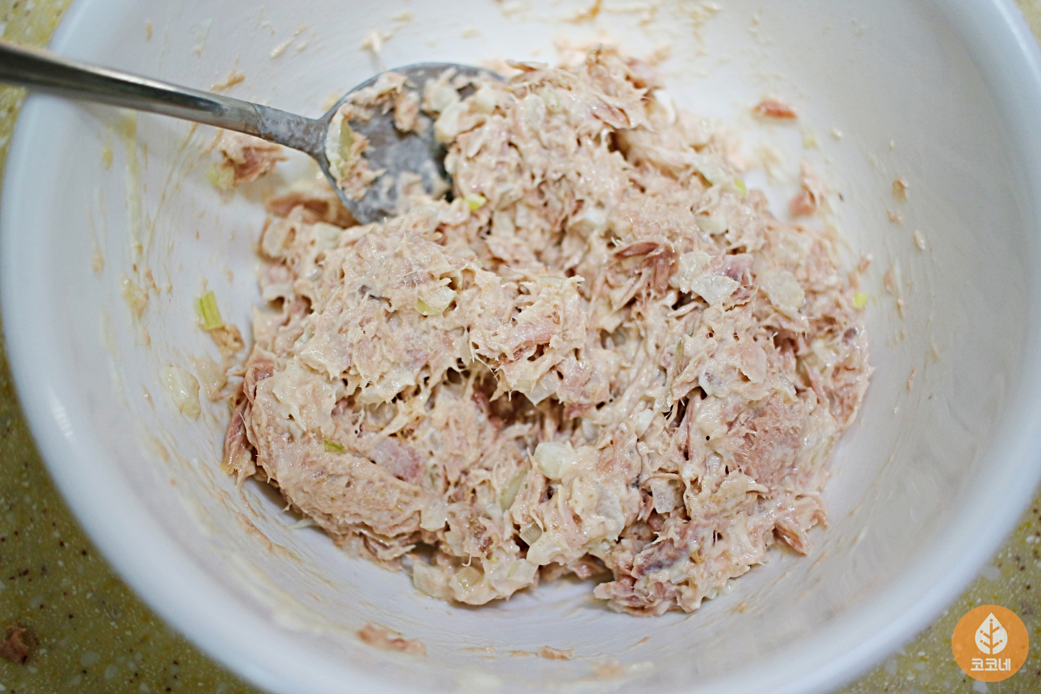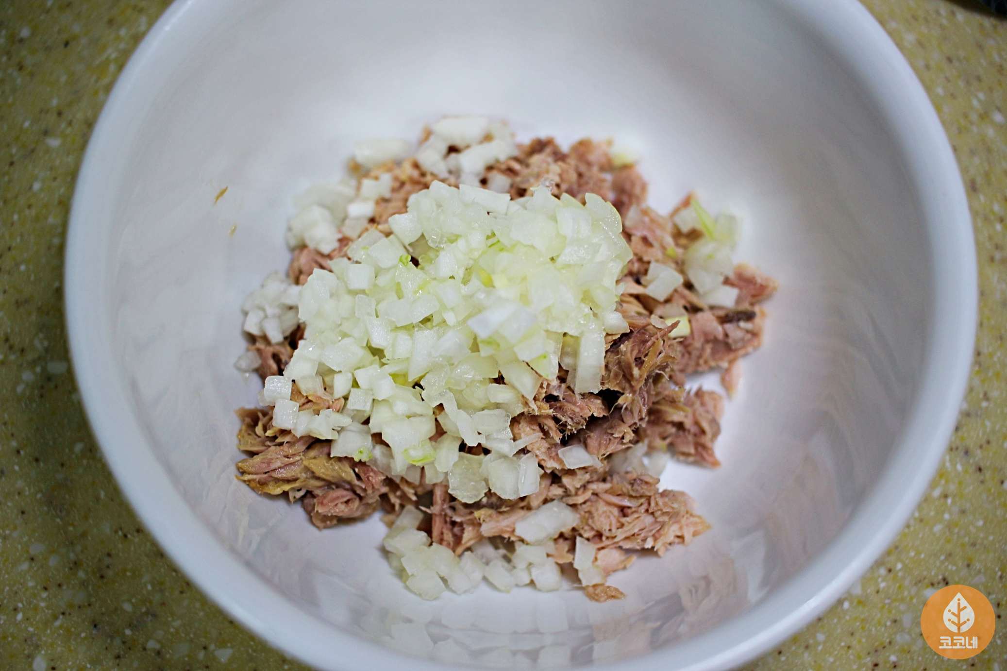 기름기 뺀 참치에 양파 잘게 다져서 넣어요.
