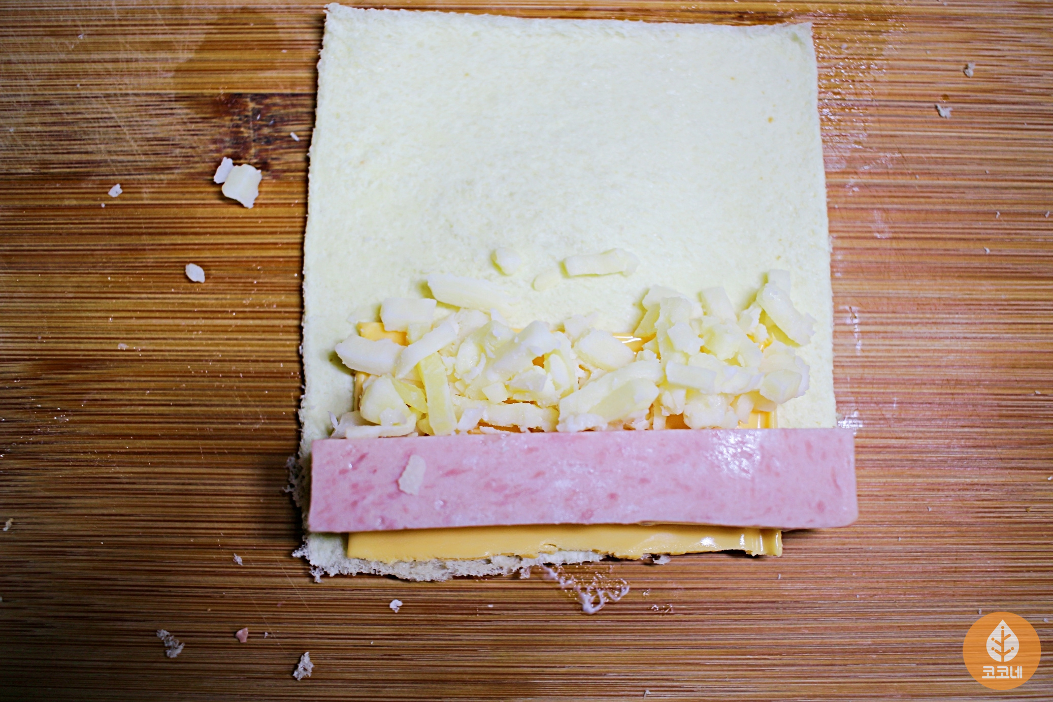 식빵 위에 참치마요랑 슬라이스치즈 올려서 돌돌 말고