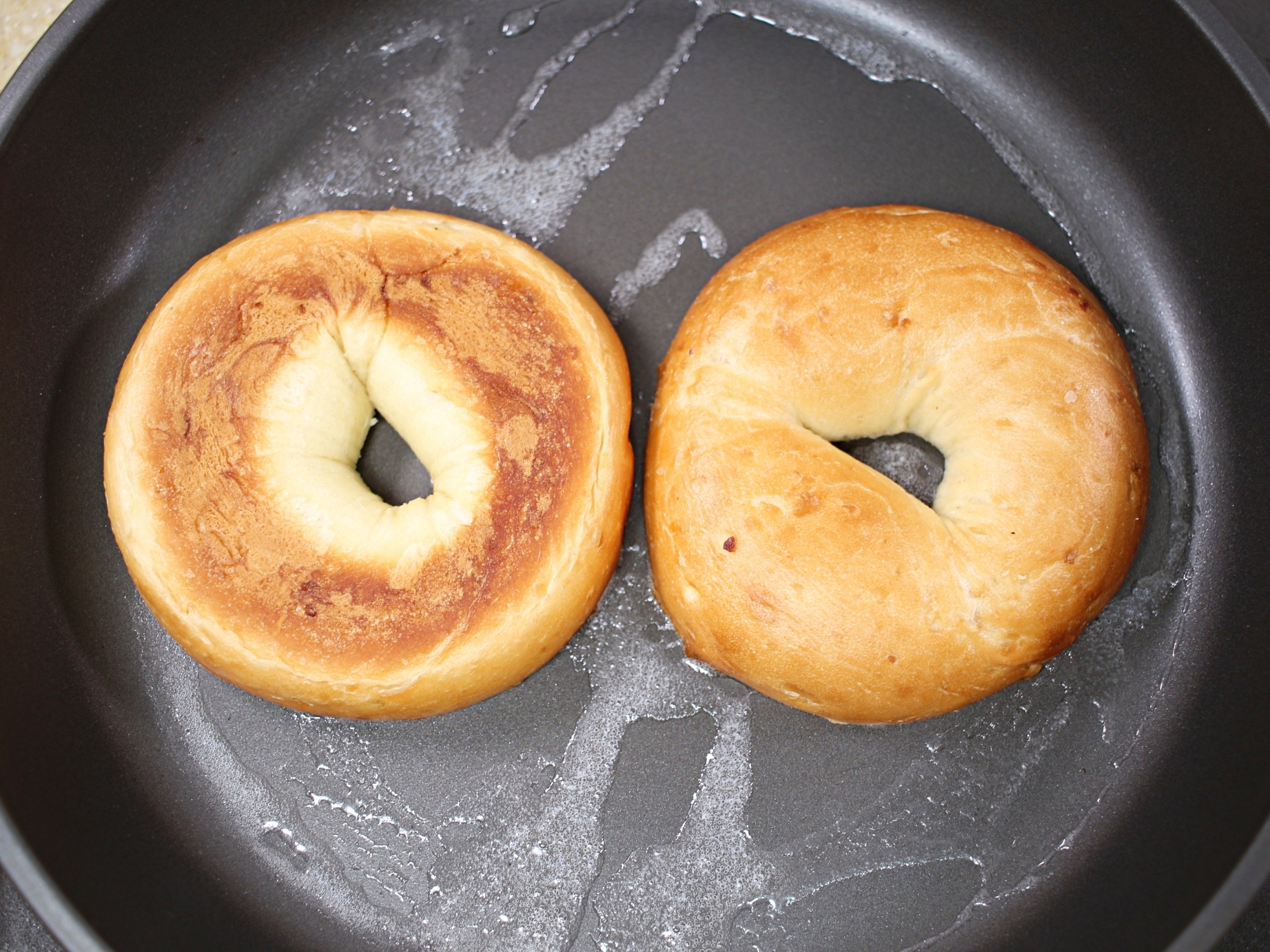 여기에 반으로 가른 베이글을 앞뒤로 구워주세요.