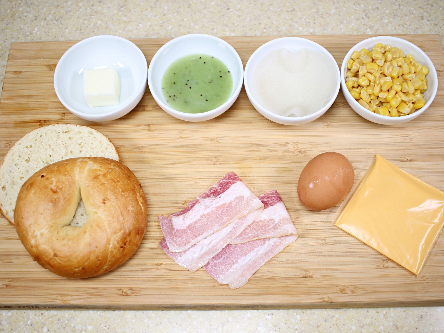 치즈, 베이컨, 달걀, 캔옥수수, 키위소스, 버터