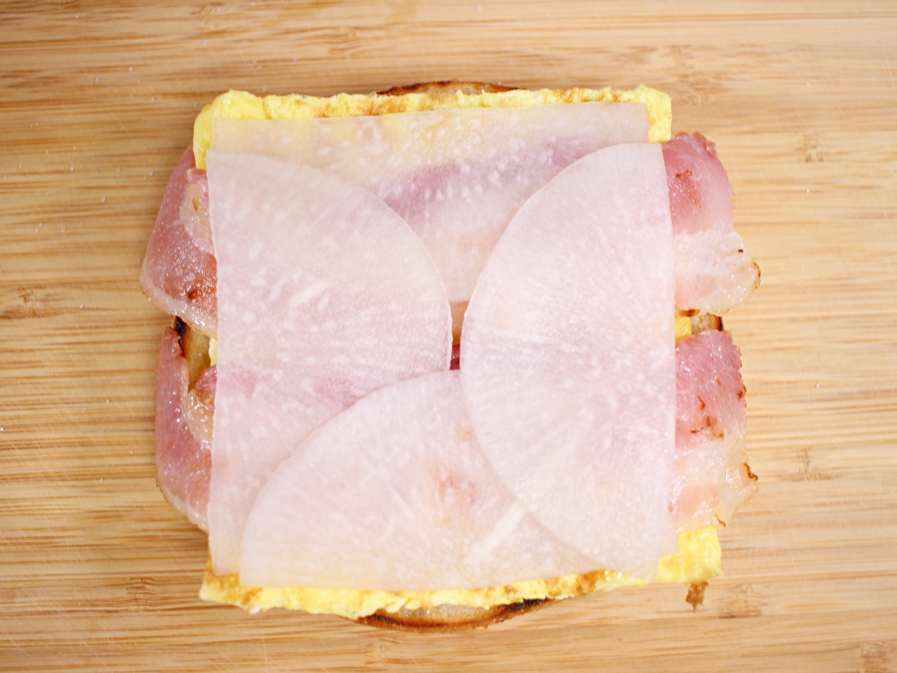 쌈무를 반으로 잘라서 빈틈없이 채워주세요.