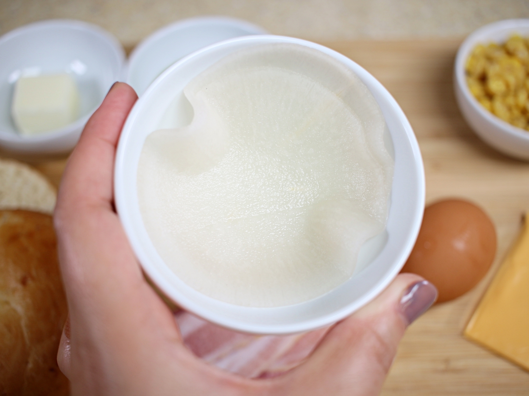 치즈, 베이컨, 달걀, 캔옥수수, 키위소스, 버터