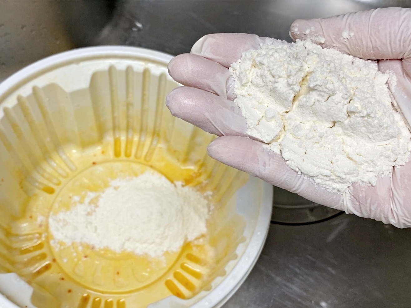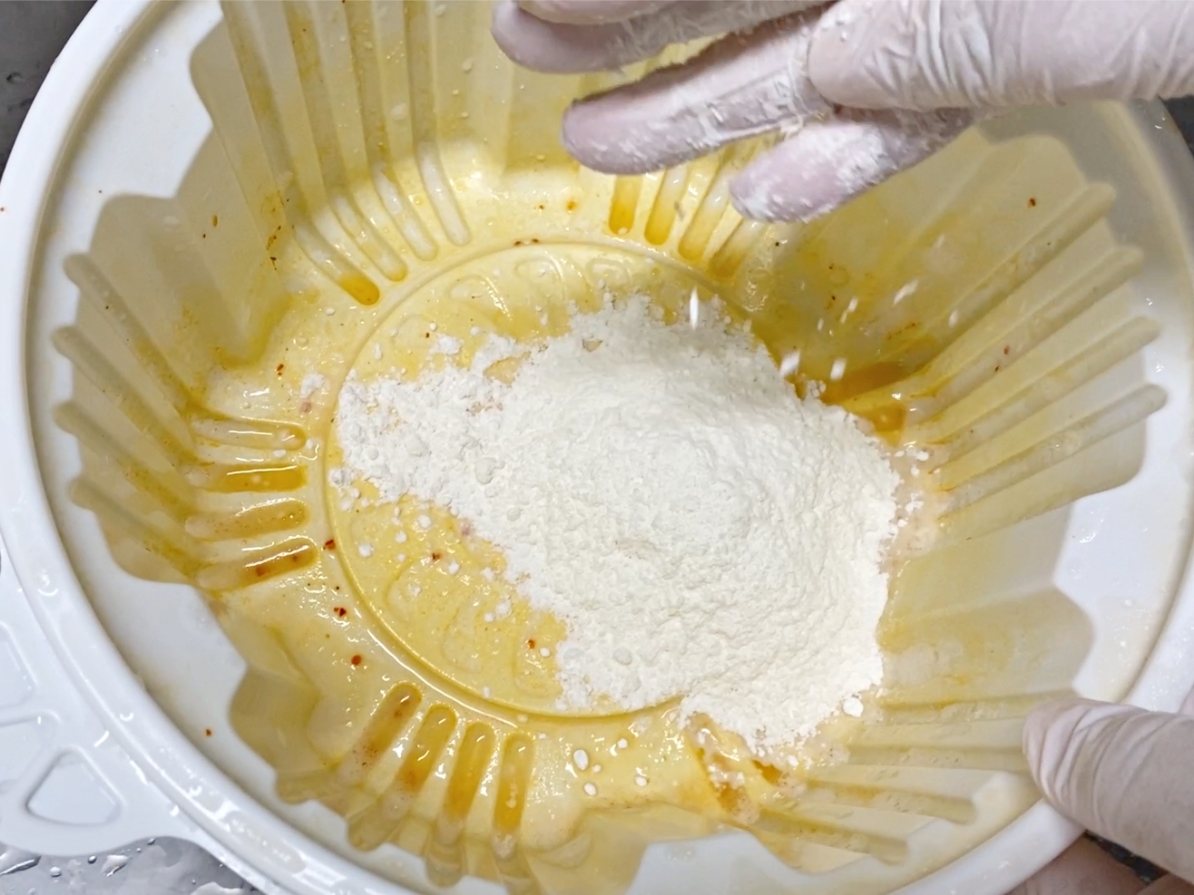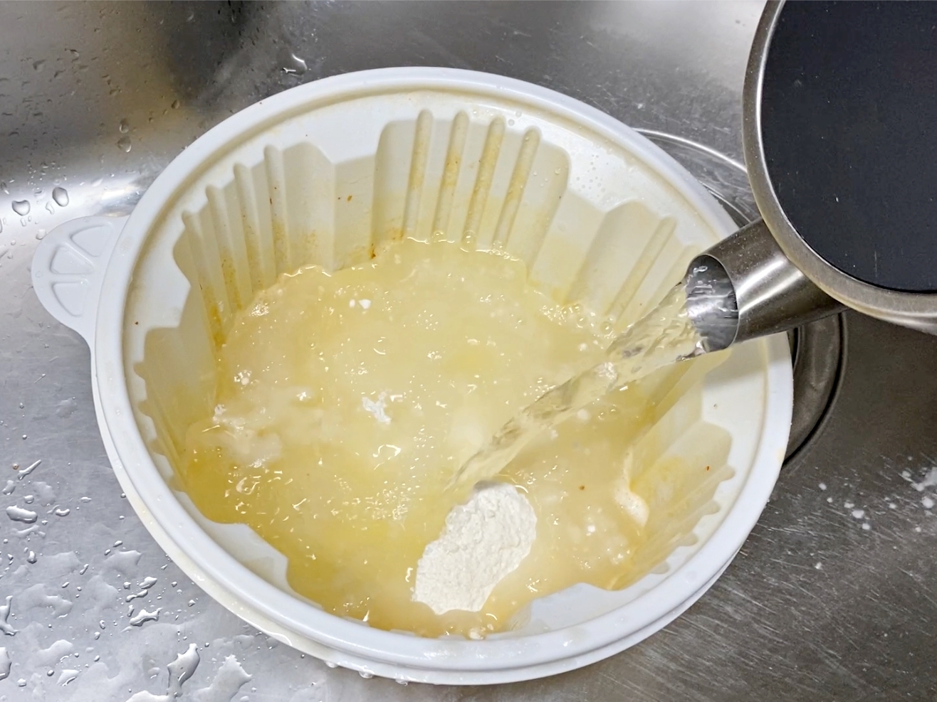 밀가루 담긴 용기에 뜨거운물을 부어주세요.
