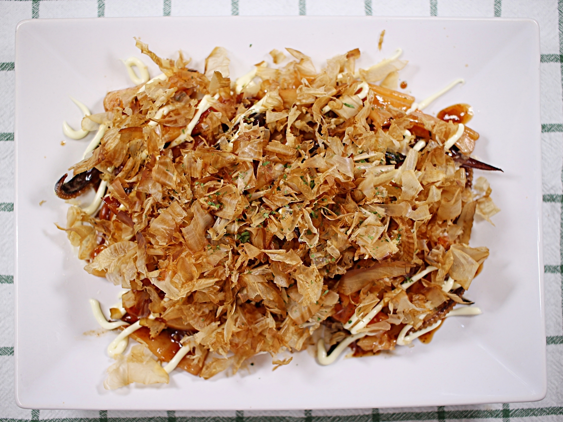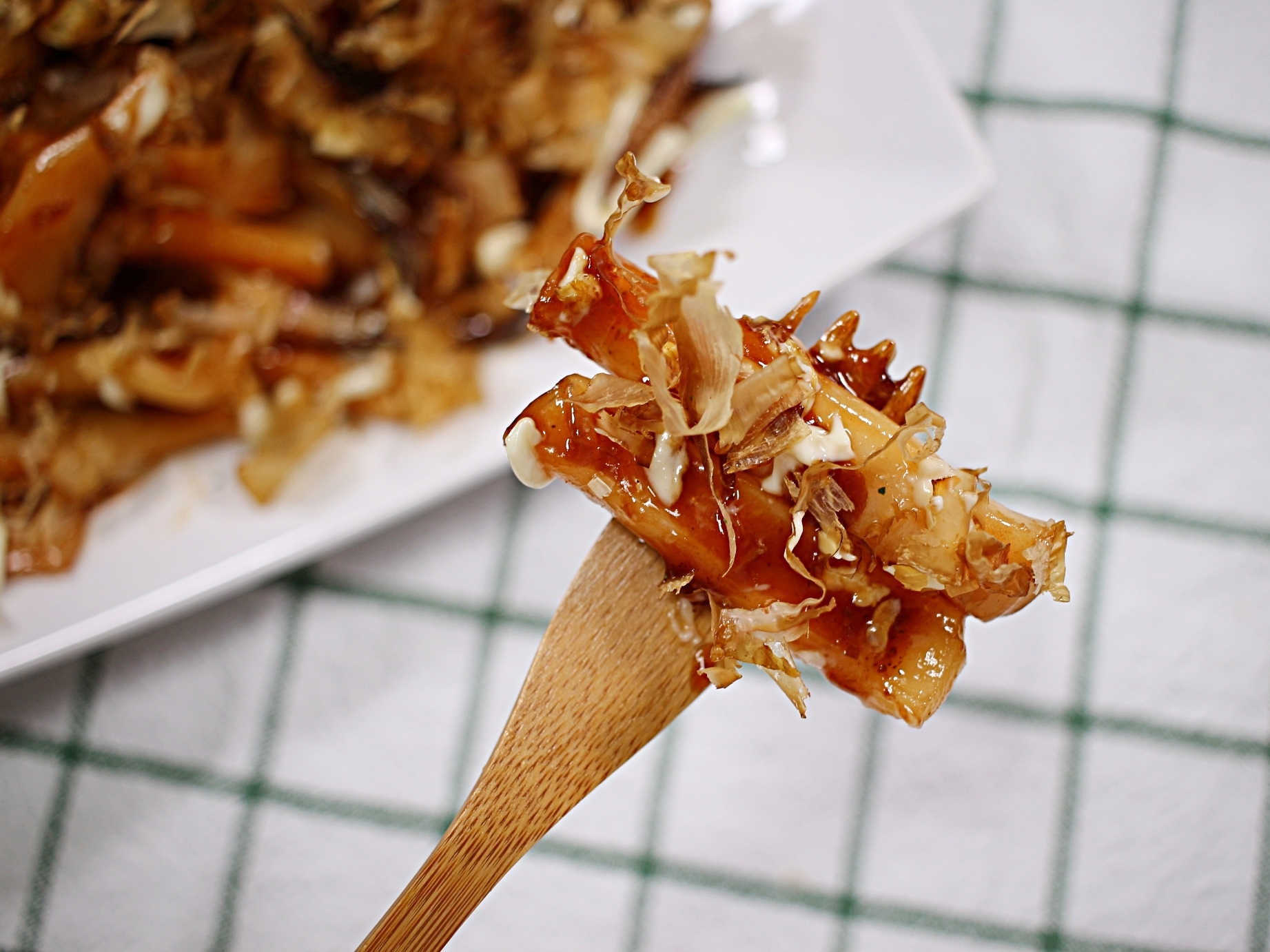 가쓰오부시 위에 마요네즈, 돈까스소스 얇게 뿌려주고요.