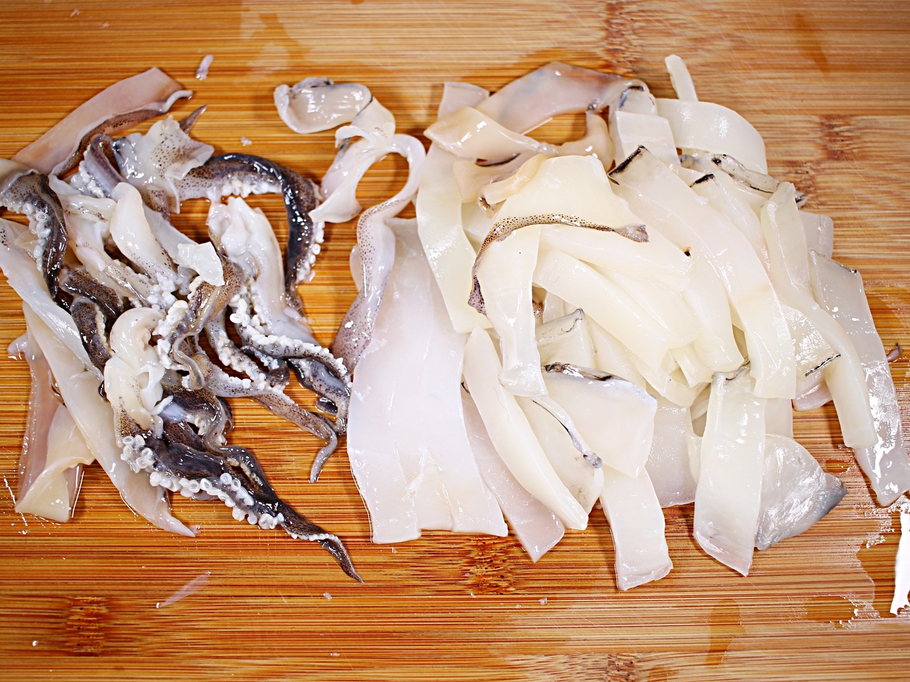먼저 오징어는 껍질을 벗기고 길쭉하게 썰어주세요.