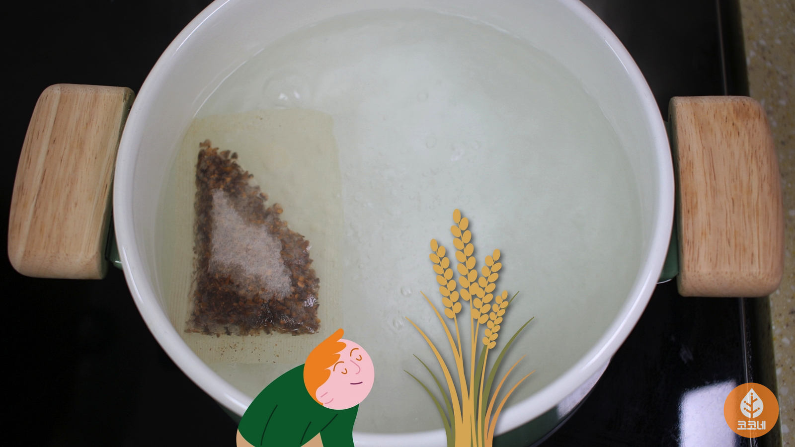 물이 끓기 시작하면 보리차 티백을 넣어요.