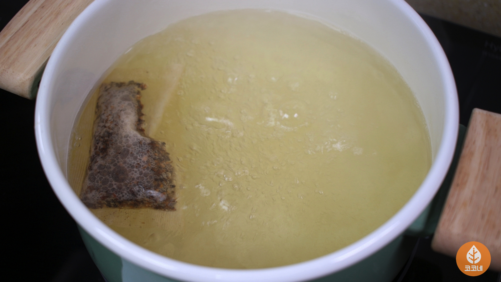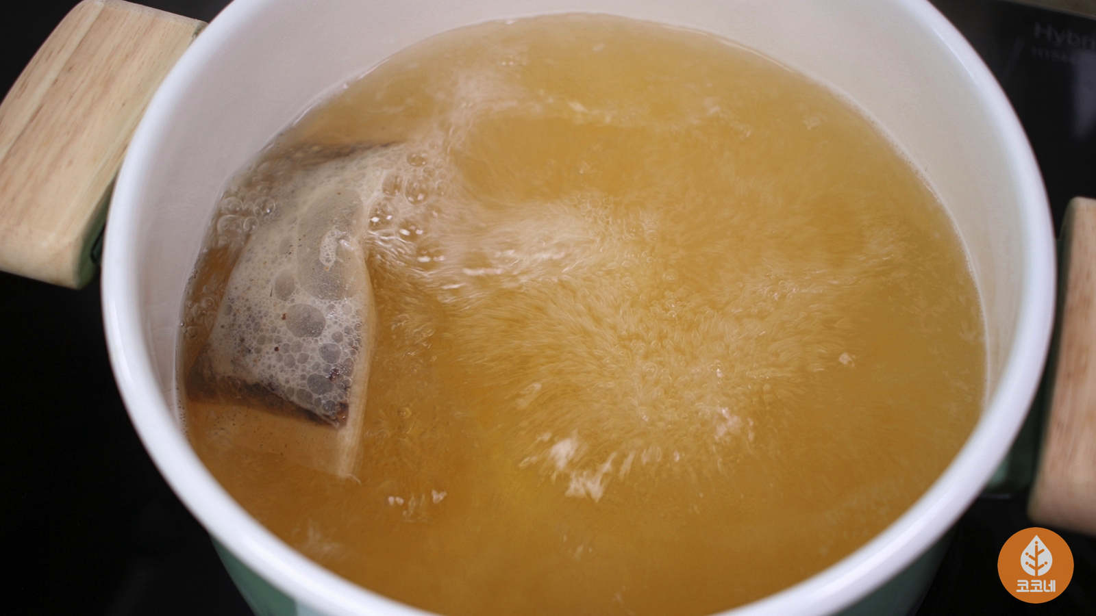 물이 끓기 시작하면 보리차 티백을 넣어요.
