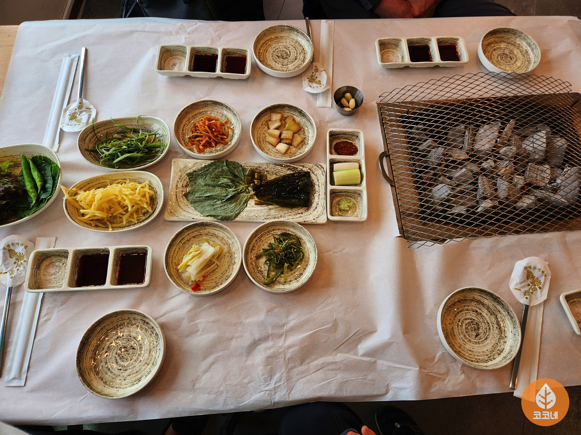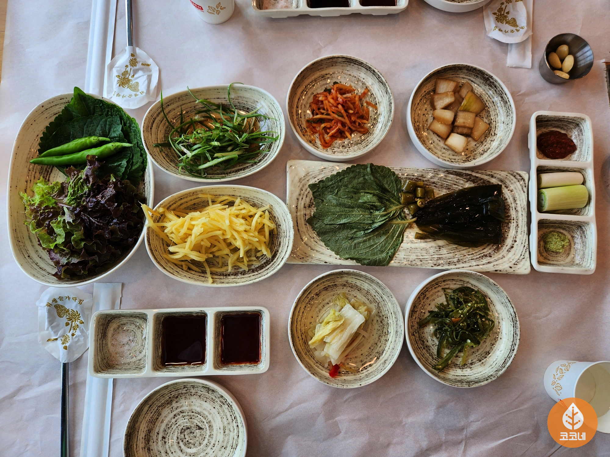생강채, 깻잎절임, 백김치, 명이나물, 양파절임 등