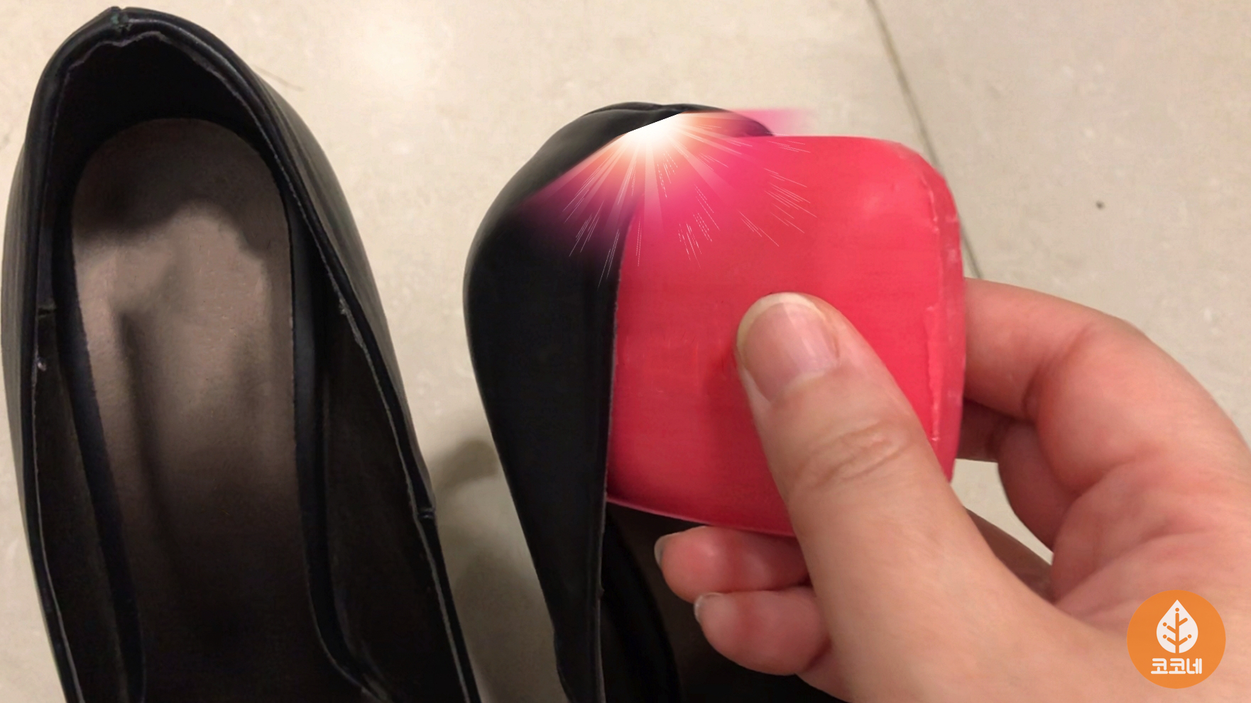 뒤꿈치가 닿는 부분을 비누로 살살 문지르면
