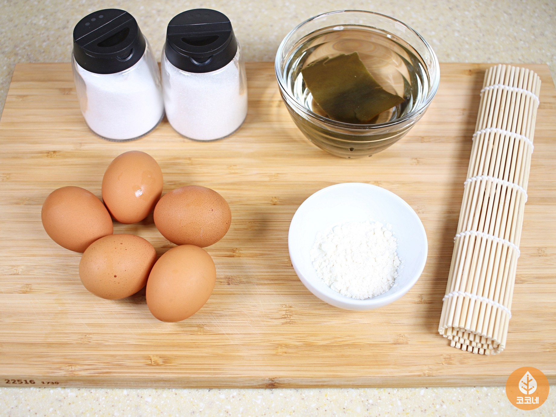 재료는 계란, 다시마, 부침가루, 설탕, 소금 준비했어요.