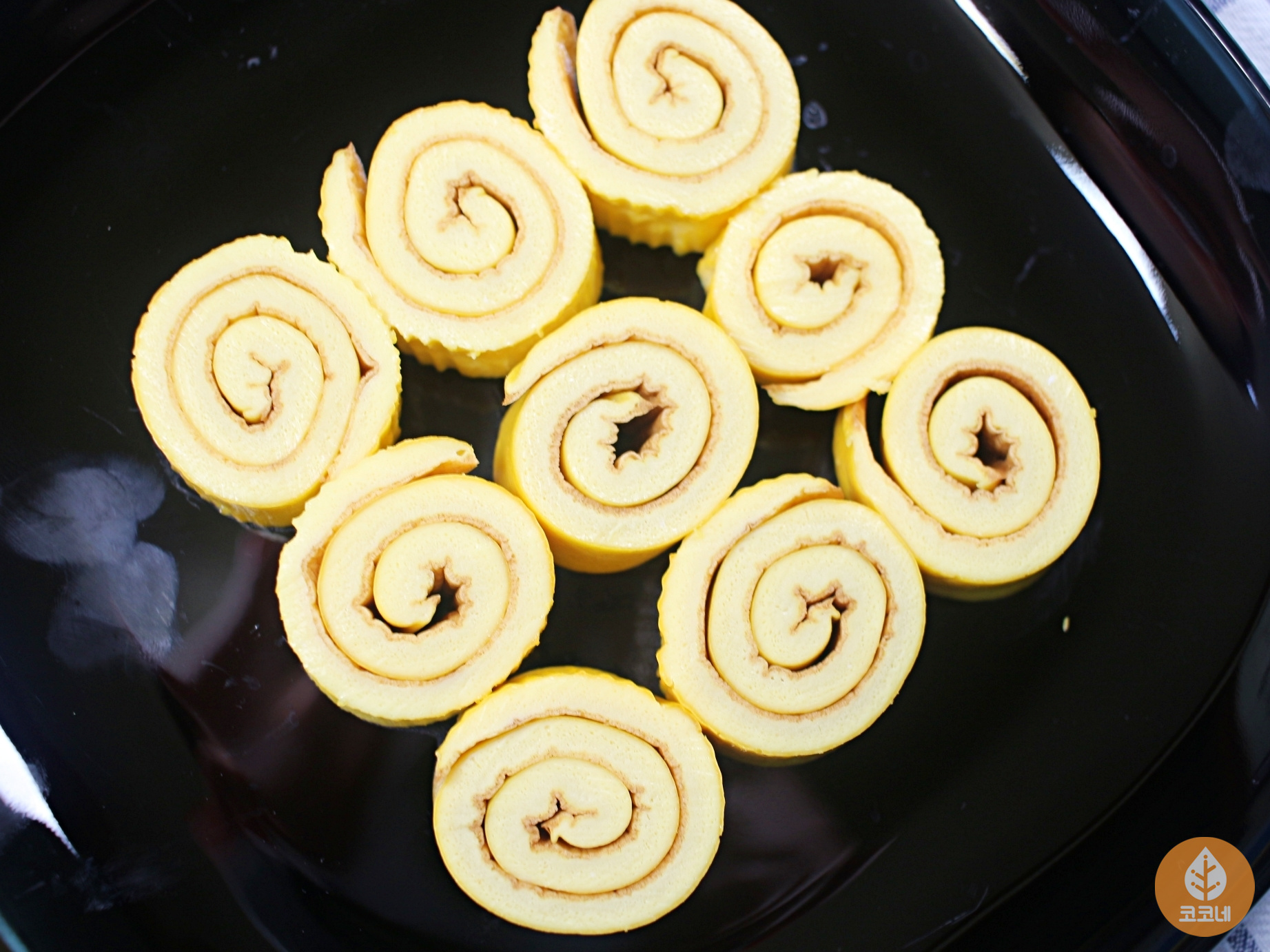 눈과 입 사로잡는 롤케이크계란말이 완성이에요.