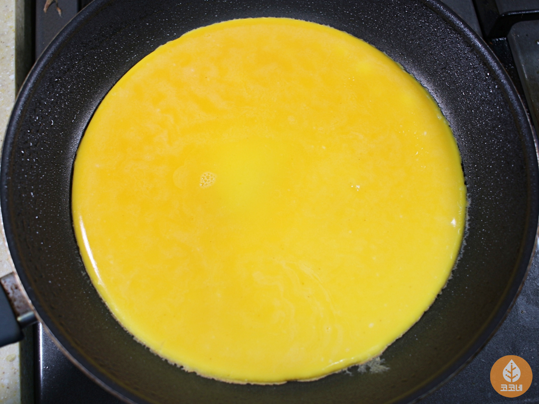 키친타월로 기름을 닦아내고 계란물을 부어요.
