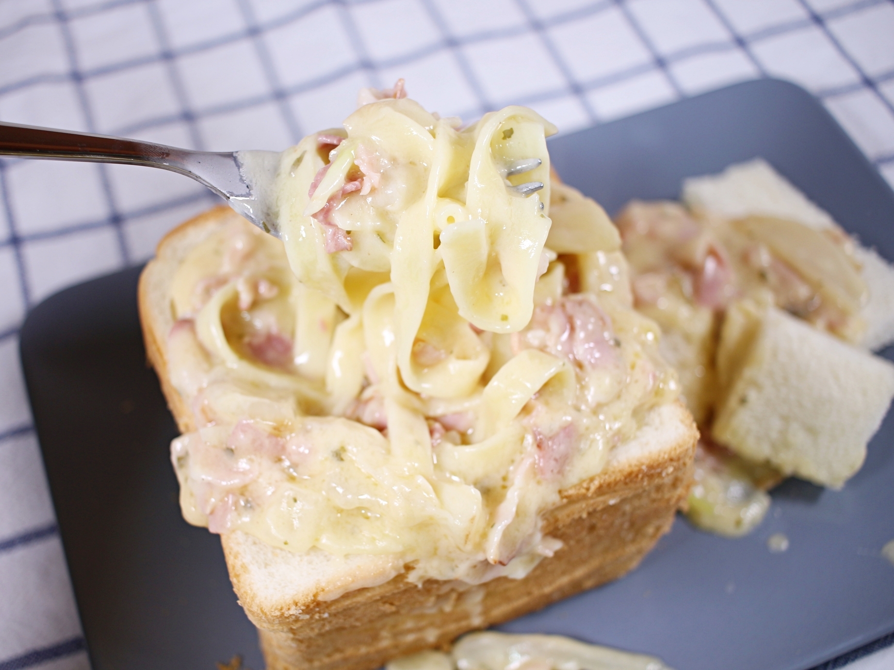 재료는 식빵, 크림소스, 파스타면, 양파, 베이컨 준비해요.