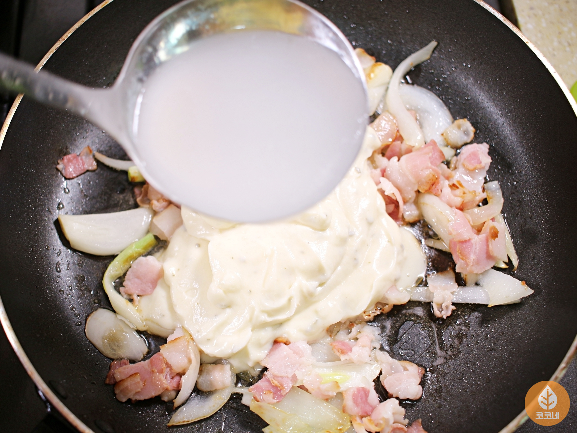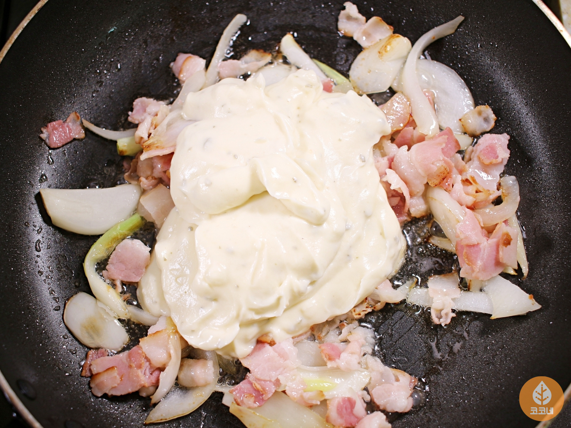 양파가 반쯤 익으면 크림소스를 붓고 끓이다가