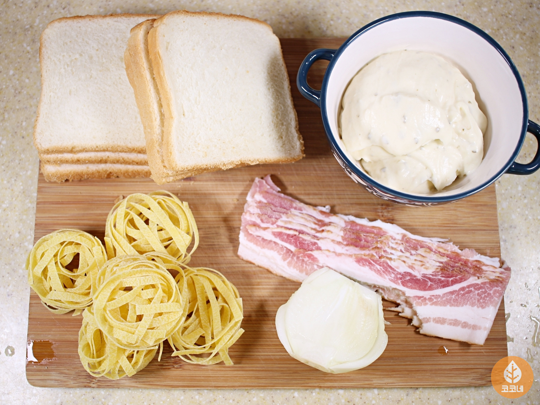 재료는 식빵, 크림소스, 파스타면, 양파, 베이컨 준비해요.