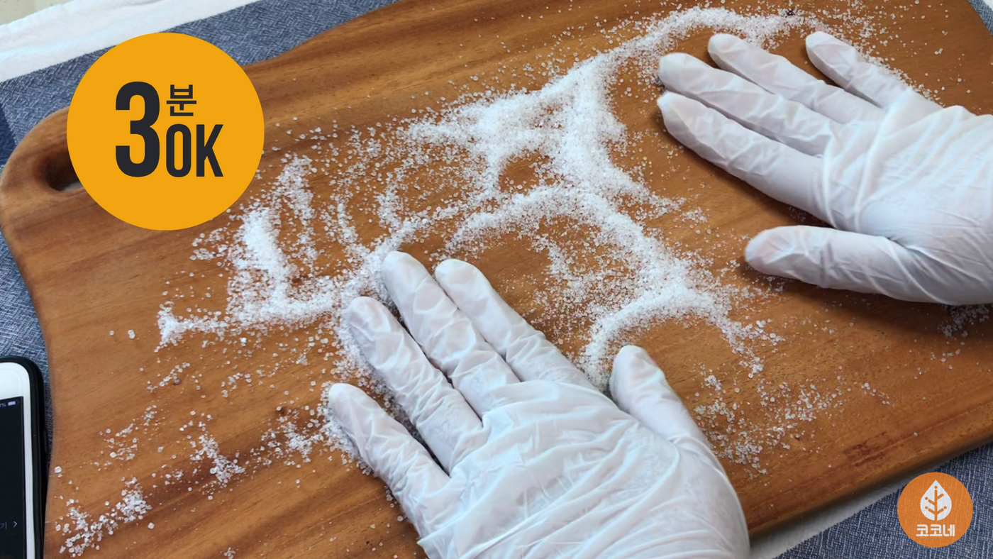 소금과 구연산을 섞어서 나무도마에 뿌린 다음