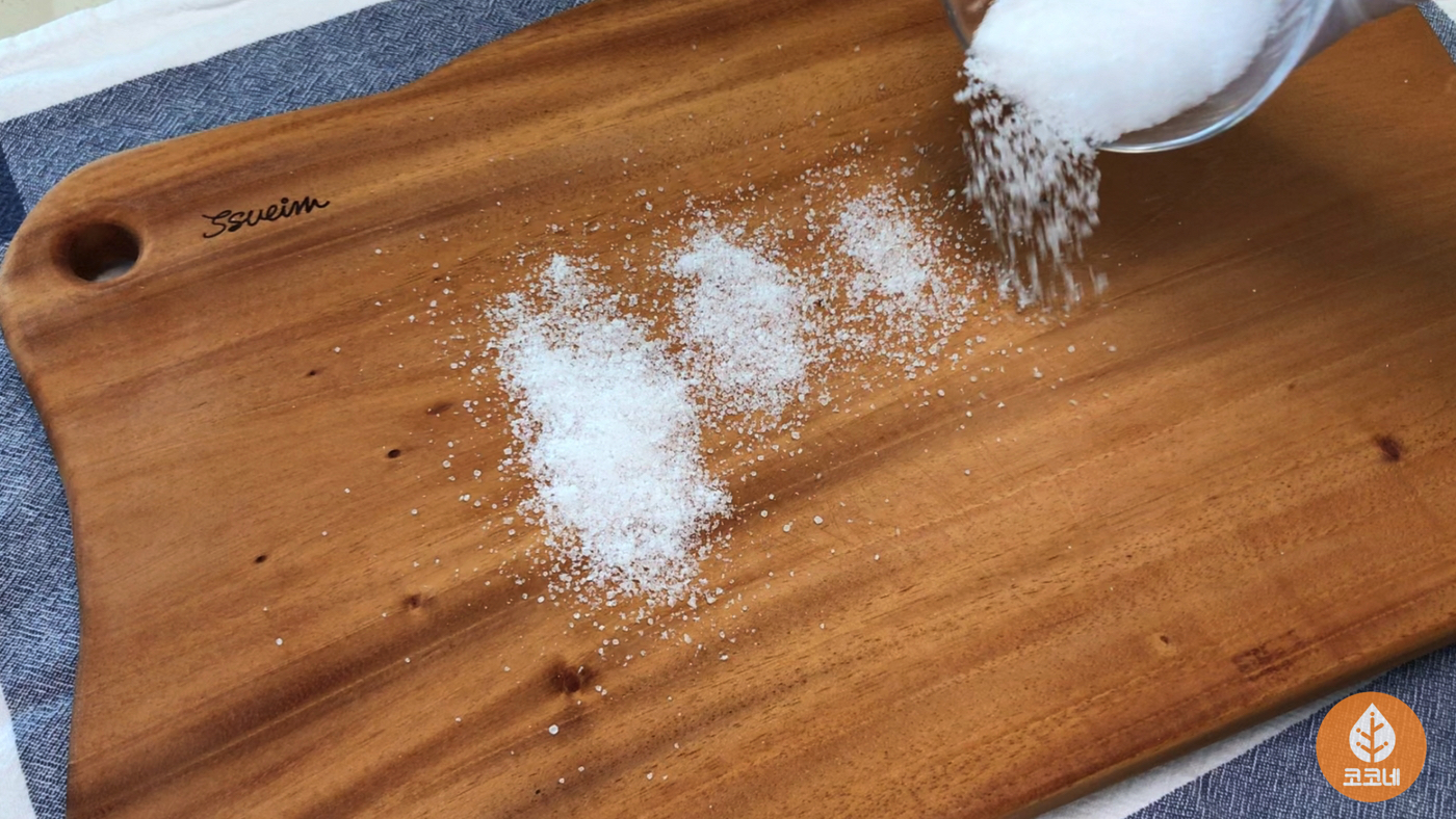 소금과 구연산을 섞어서 나무도마에 뿌린 다음