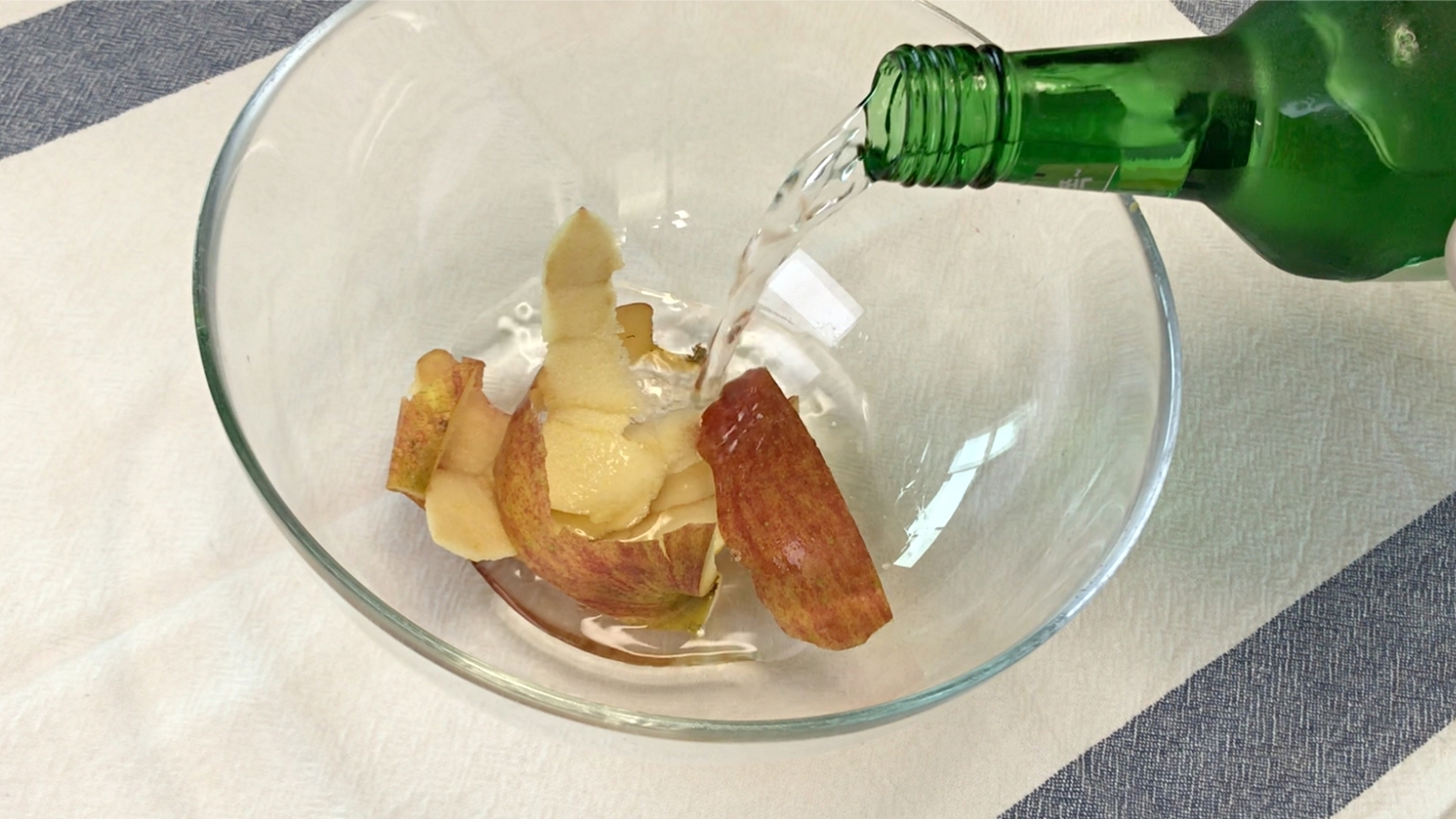 사과 반개 분량의 껍질에 소주 반병을 부어주세요.
