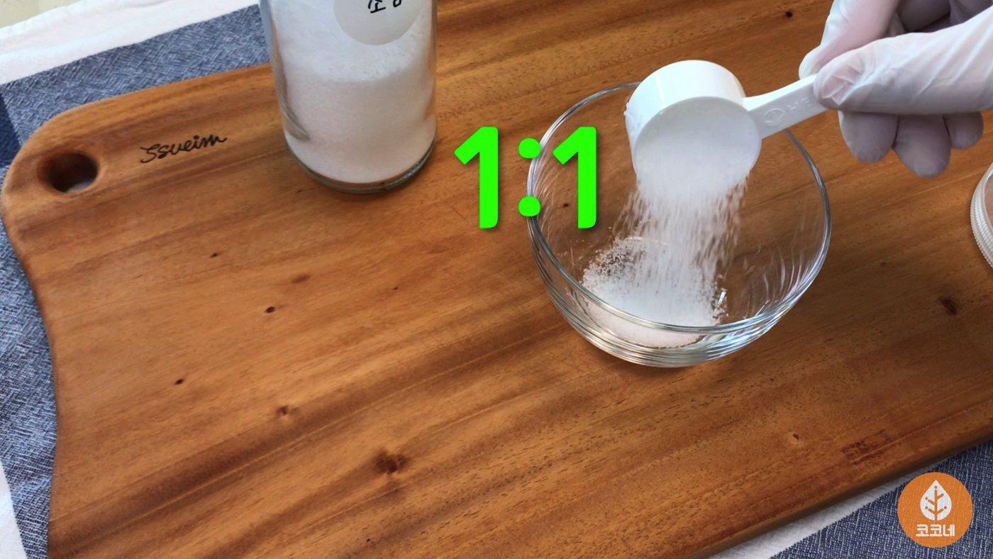 소금과 구연산을 1:1로 섞어주세요.