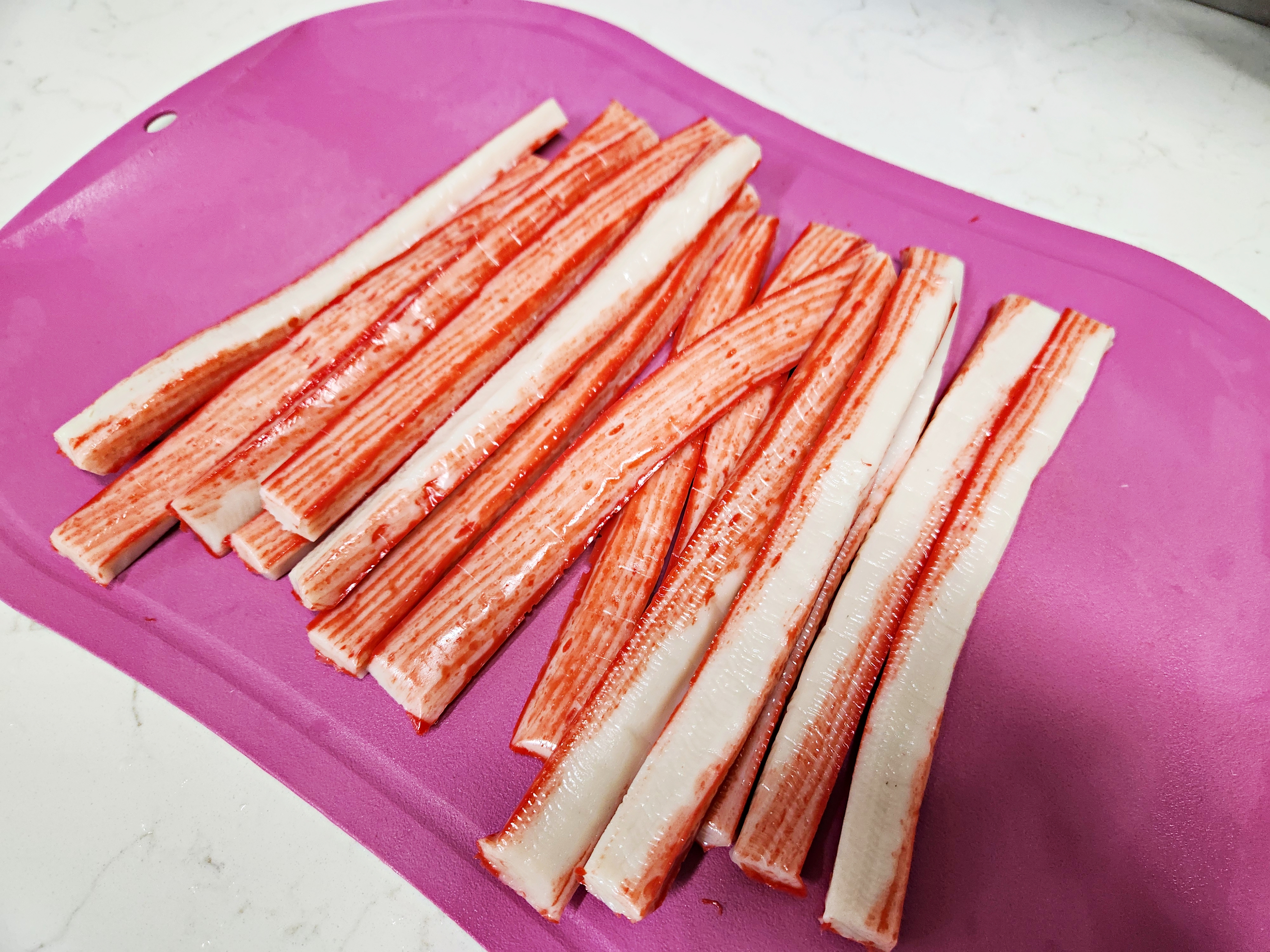 먼저 맛살에 씌워져 있는 비닐을 깔끔하게 벗겨 준비해 주세요.