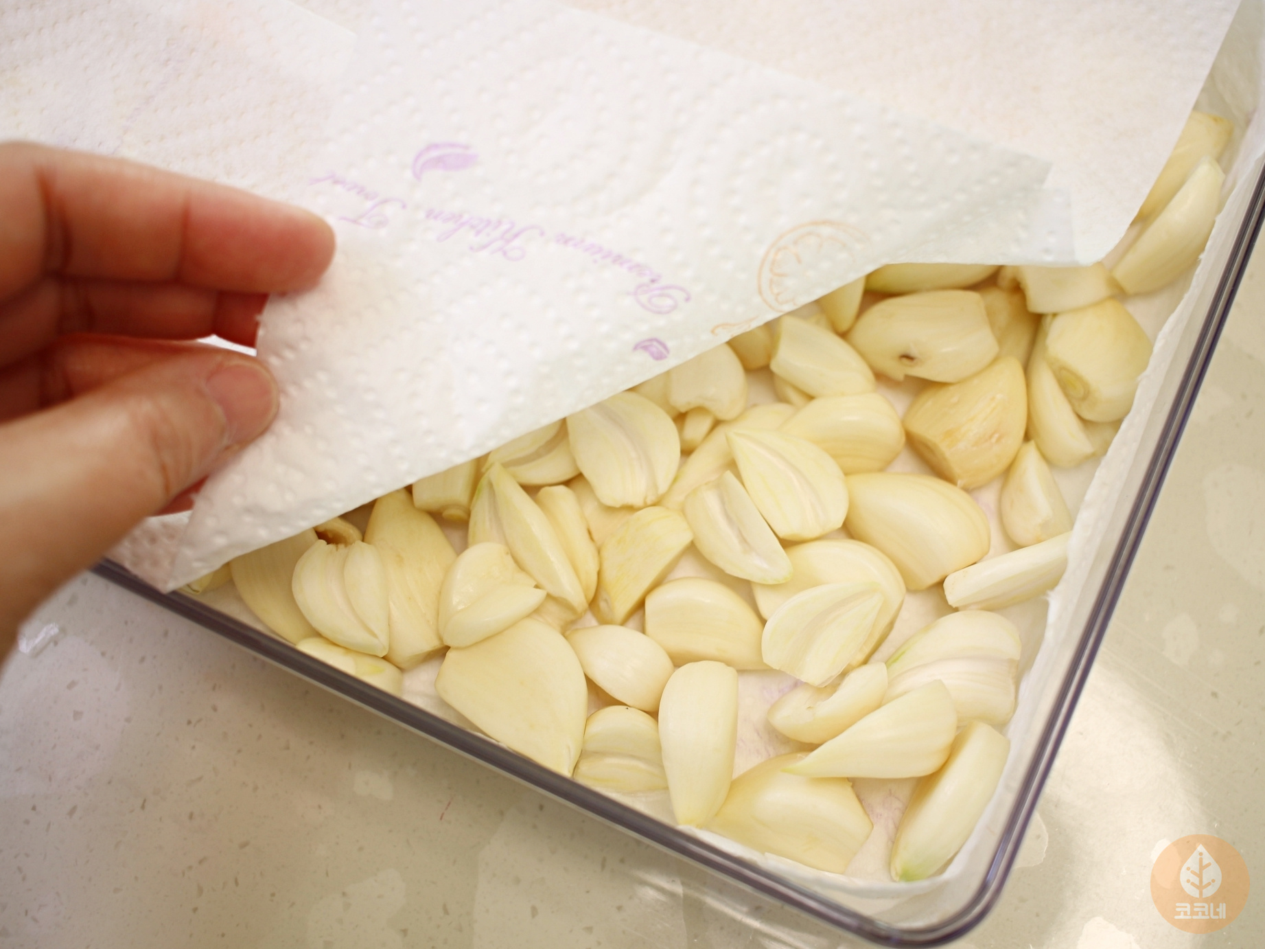마늘 보관 용기에 설탕을 깔고 키친타월로 덮은 다음