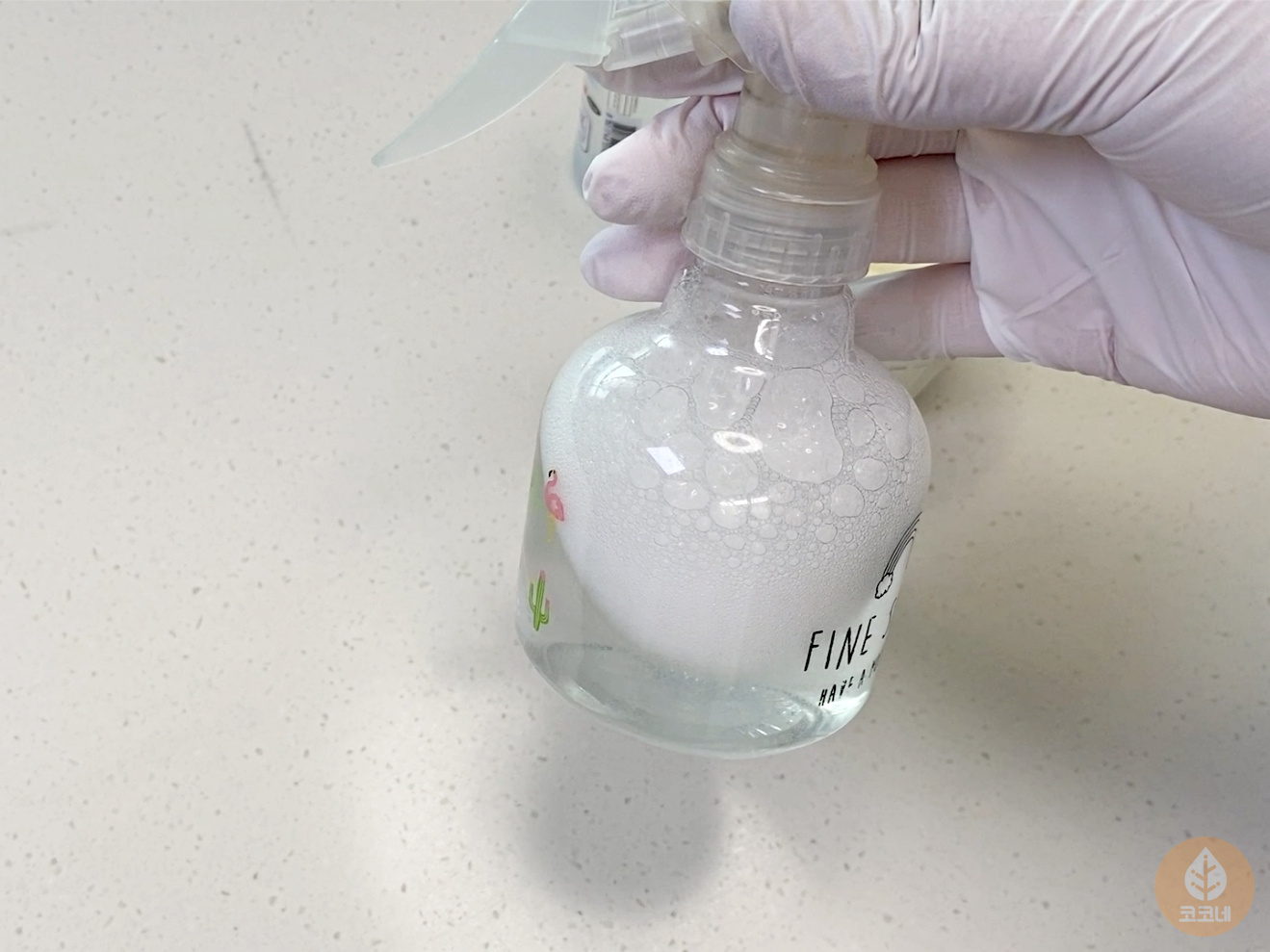 미지근한 물 한컵(종이컵 기준)을 분무기에 붓고