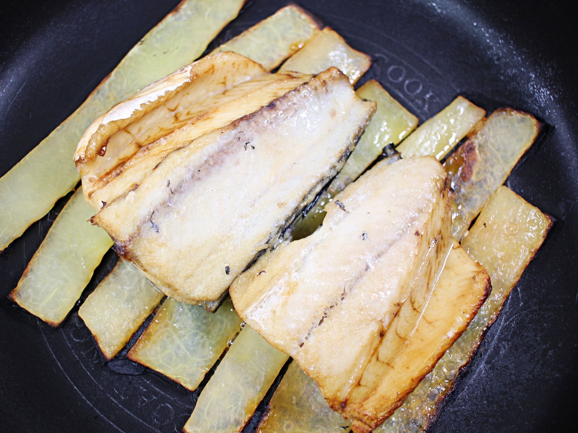 후라이팬이 달궈지면서 생선 자체 기름이 배어나와요.