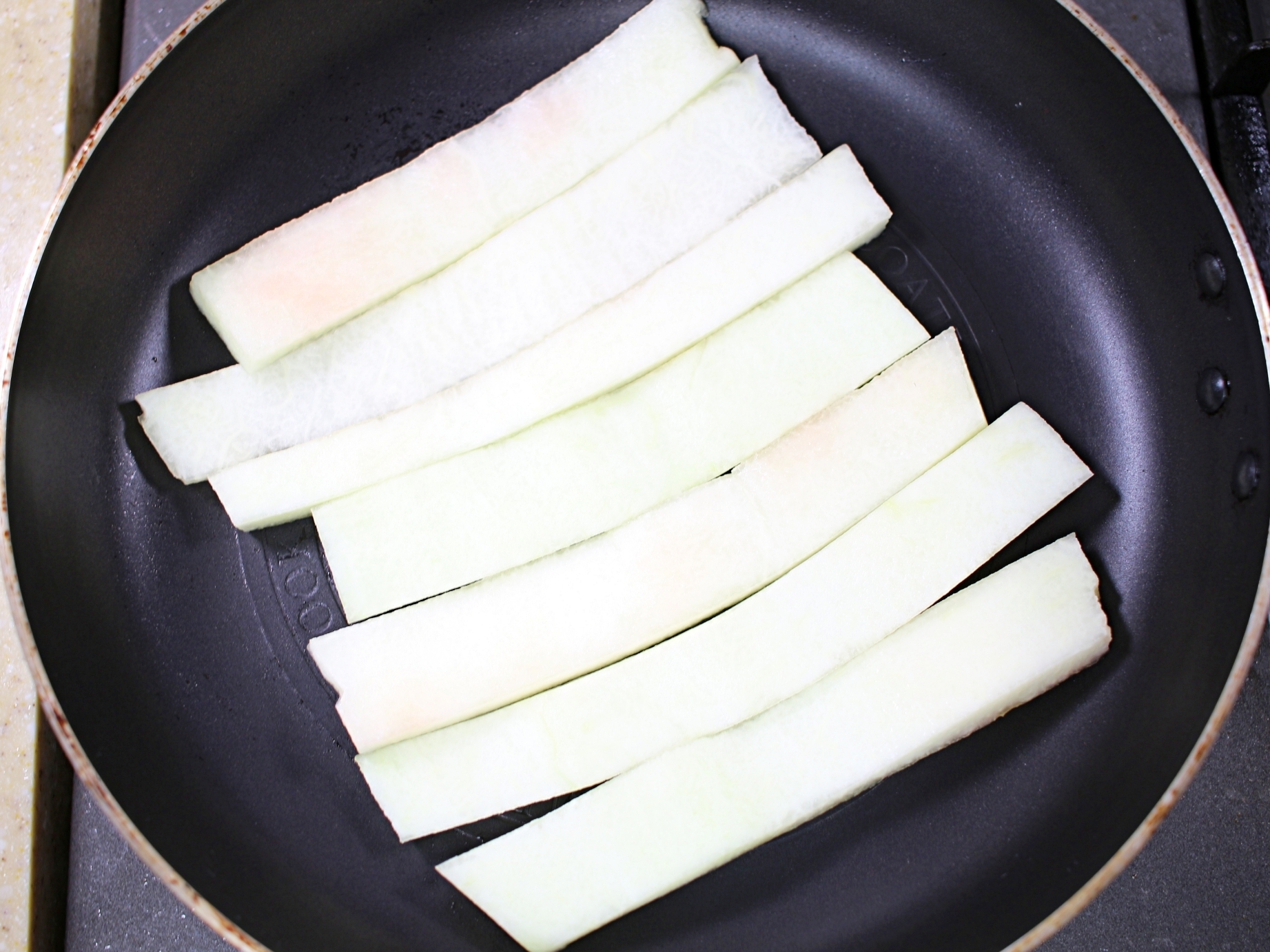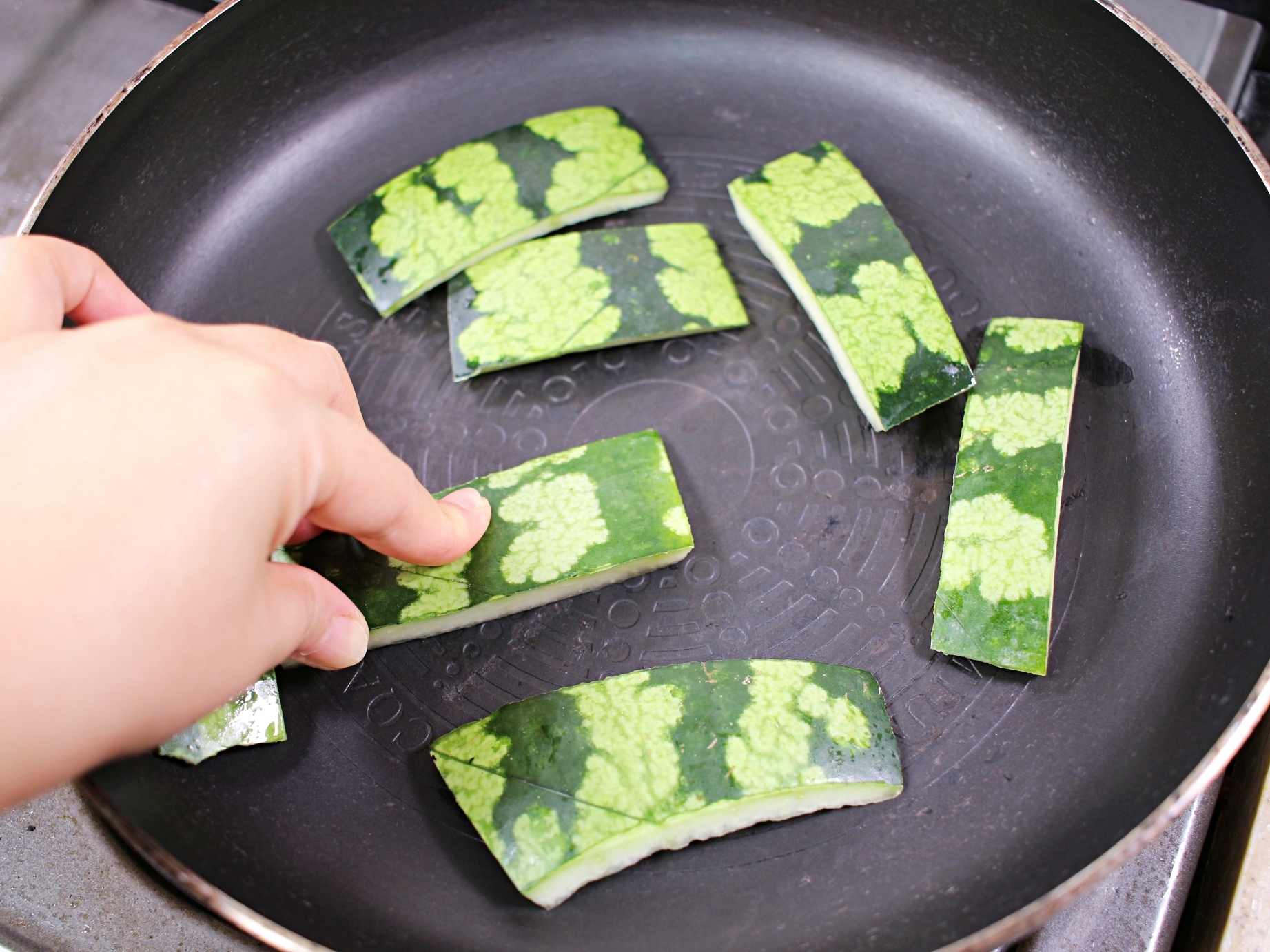 후라이팬에 수박껍질 흰부분을 빈틈없이 올려주세요.